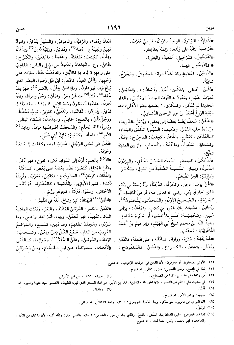 • الدِّمْنُ، بالكسر: السِّرْقينُ المُتَلَبِّدُ، والبَعَرُ، ودَمَّنَتِ الماشِيَةُ المَكانَ تَدْمِيناً، فهو مُتَدَمِّنٌ، وبهاء: آثارُ الدارِ والناسِ، وما سَوَّدُوا، والحِقْدُ القَديمُ، وقد دَمِنَ، كسَمِعَ، والمَوْضِعُ القَرِيبُ من الدارِ، جَمْعُ الكُلِّ دِمَنٌ ودِمْنٌ. وكَسحابٍ: الرَّمادُ، والسِّرْقِينُ، وعَفَنُ النَّخْلَةِ، وسَوادُها،