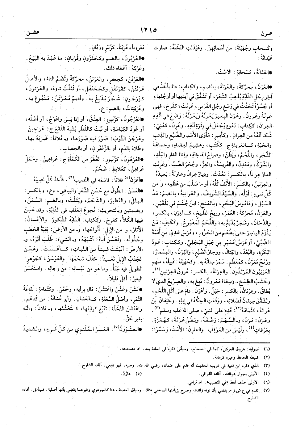 ورُمْحٌ مُعَرَّنٌ، كمُعَظَّمٍ: سُمِّرَ سِنانُهُ به. وكجُهَيْنَةَ: قَبيلَةٌ، منهم العُرَنِيُّونَ المُرْتَدُّونَ.