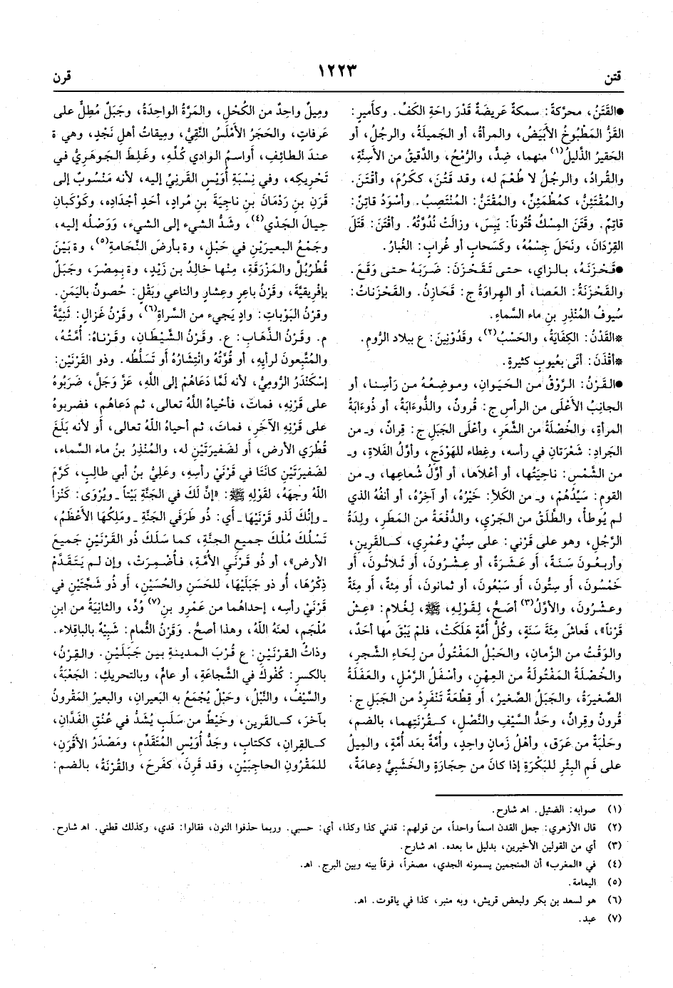 وهي ة عندَ الطائِفِ، أَو اسمُ الوادي كُلِّهِ، وغَلِطَ الجَوهَرِيُّ في تَحْرِيكِه، وفي نِسْبَةِ أُوَيْسٍ القَرَنِيِّ إليه، لأنه مَنْسُوبٌ إلى قَرَنِ بنِ رَدْمَانَ بنِ ناجِيَةَ بنِ مُرادٍ، أحَدِ أجْدَادِه، وكَوْكَبانِ حِيالَ الجَدْي، وشَدُّ الشيء إلى الشيء، وَوَصْلُه إليه، وجَمْعُ البعيرَيْنِ في حَبْلٍ،