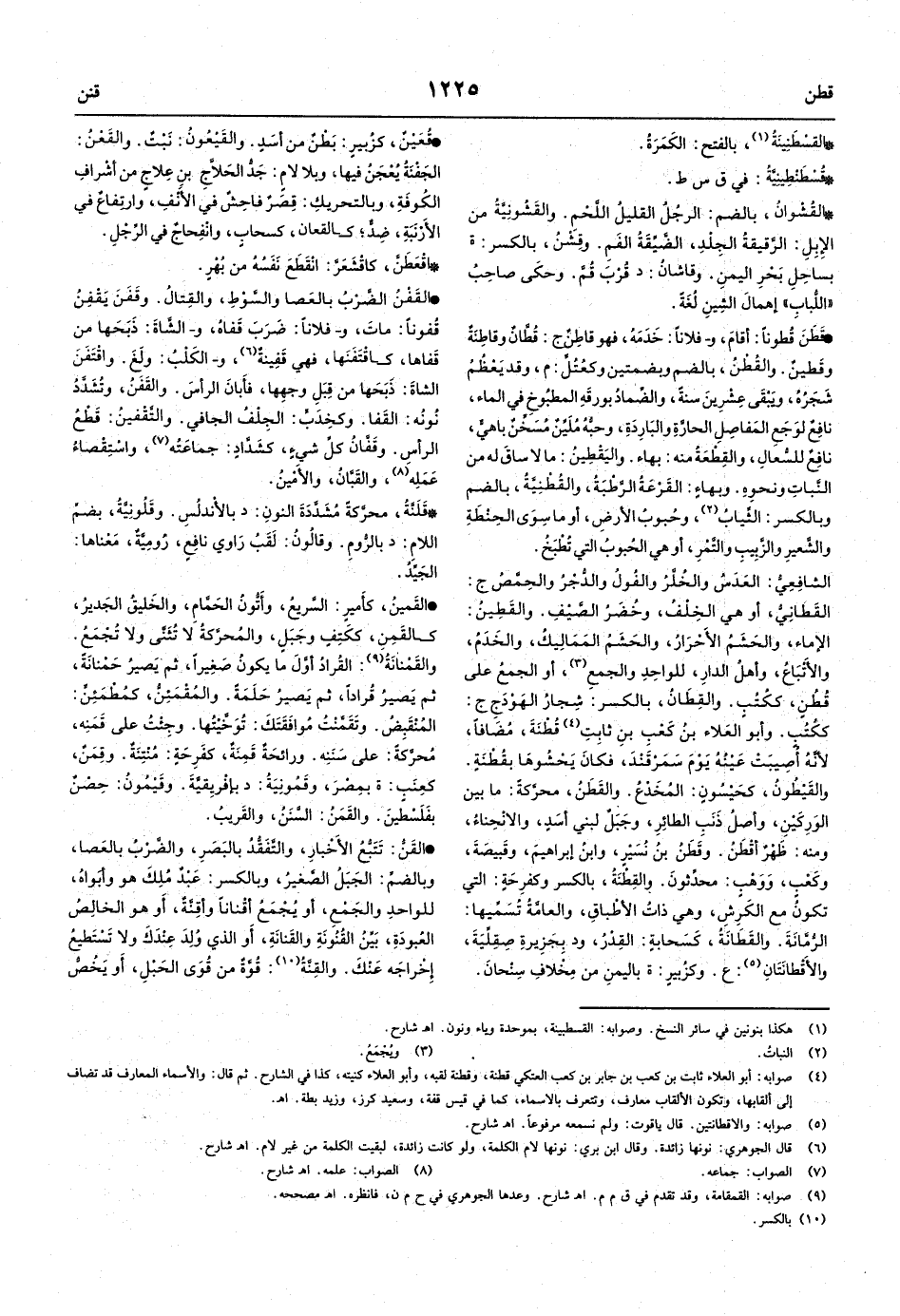 والقُطْنُ، بالضم وبضمتين وكعُتُلٍّ: م، وقد يَعْظُمُ شجرُهُ، ويَبْقَى عِشْرِينَ سنةً، والضِّمادُ بورَقهِ المطبُوخِ في الماء، نافِعٌ لوَجَعِ المَفاصِلِ الحارَّةِ والبارِدَةِ، وحبُّهُ مُلَيِّنٌ مُسَخِّنٌ باهيٌّ، نافِعٌ للسُّعالِ، والقِطْعَةُ منه: بهاء.