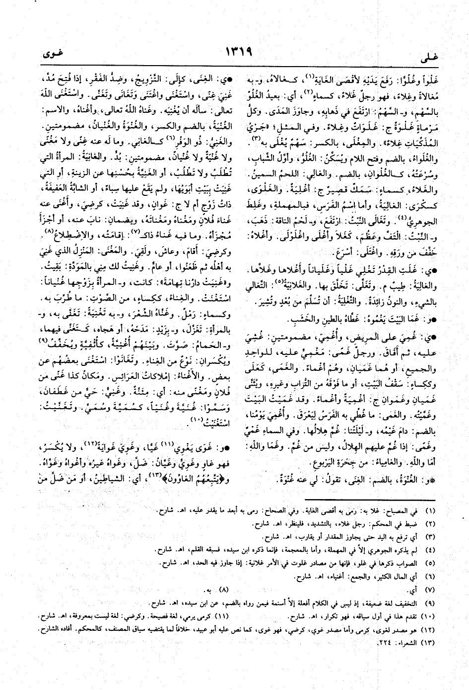 • ي: الغِنَى، كإلَى: التَّزْوِيجُ، وضِدُّ الفَقْرِ، وإذا فُتِحَ مُدَّ، غَنِيَ غِنًى، واسْتَغْنَى واغْتَنَى وتَغَانَى وتَغَنَّى.