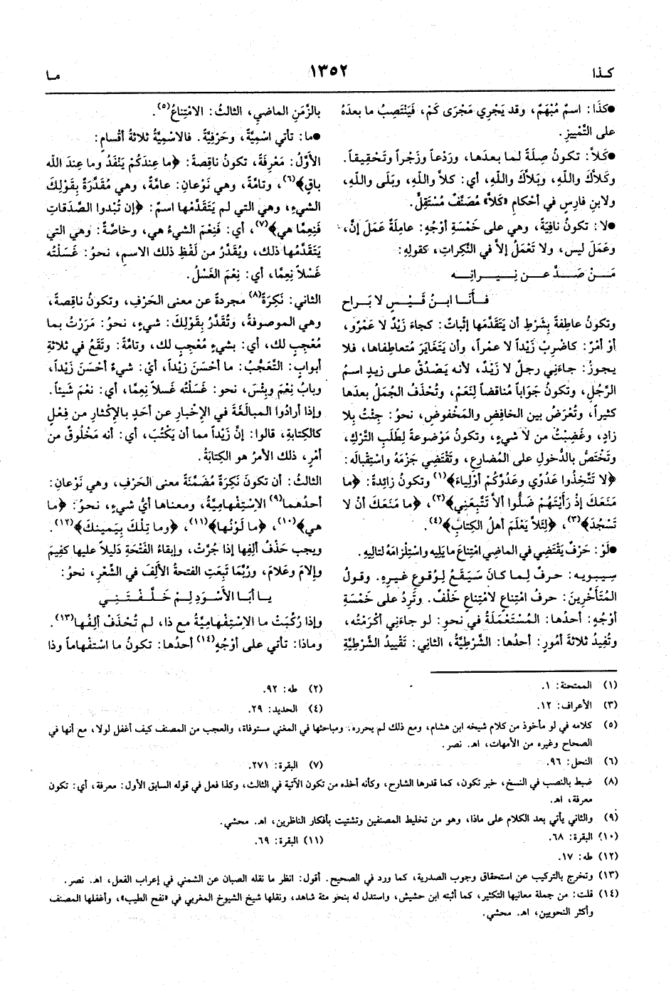 الأَوَّلُ: مَعْرِفَةً، وتكونُ ناقِصةً: {ما عِندَكُمْ يَنْفَدُ وما عِندَ الله باقٍ} ، وتامَّةً، وهي نَوْعانِ: عامَّةٌ، وهي مُقَدَّرَةٌ بِقَوْلِكَ الشيء، وهي التي لم يَتَقَدَّمْها اسمٌ: {إن تُبْدوا الصَّدَقاتِ فَنِعِمَّا هي} ، أي: فَنِعْمَ الشيءُ هي، وخاصَّةٌ: وهي التي يَتَقَدَّمُها ذلك، ويُقَدَّرُ من لَفْظِ ذلك الاسمِ، نحوُ: غَسَلْتُه غَسْلاً نِعِمَّا، أي: نِعْمَ الغَسْلُ.