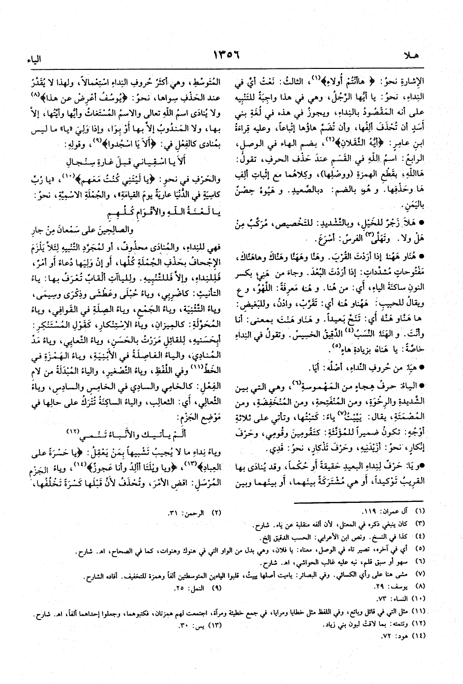 فهي للنِداءِ، والمُنادَى محذوفٌ، أو لمُجَرَّدِ التَّنْبِيهِ لِئَلاَّ يَلْزَمَ الإِجْحافُ بحَذْفِ الجُمْلَةِ كُلِّها، أَو إنْ وَلِيَها دُعاءٌ أَو أمْرٌ، فَللنِداءِ، وإلاَّ فَللتَّنْبِيهِ. ولِلياآتِ ألْقابٌ تُعْرَفُ بها: ياءُ التأنيثِ: كاضْرِبِي، وياءُ حُبْلَى وعَطْشَى وذِكْرَى وسِيمَى، وياءُ التَّثْنِيَةِ، وياءُ الجَمْعِ، وياءُ الصِلَةِ في القَوافِي، وياءُ المُحَوَّلَةِ: كالمِيزانِ، وياءُ الاسْتِنْكارِ، كَقَوْلِ المُستَنْكِرِ: أبِحَسَنيهِ، لِلقائِلِ مَرَرْتُ بالحَسَنِ، وياءُ التَّعايِي، وياءُ مَدِّ المُنادِي، والياءُ الفاصِلَةُ في الأَبْنِيَةِ، وياءُ الهَمْزَةِ في الخَطِّ وفي اللَّفْظِ، وياءُ التَّصْغيرِ، والياءُ المُبْدَلَةُ من لامِ الفِعْلِ: كالخامِي والسادِي في الخامِسِ والسادِسِ، وياءُ الثَّعالِي، أَي: الثعالِب، والياءُ الساكِنَةُ تُتْرَكُ على حالِها في مَوْضِع الجَزْمِ: