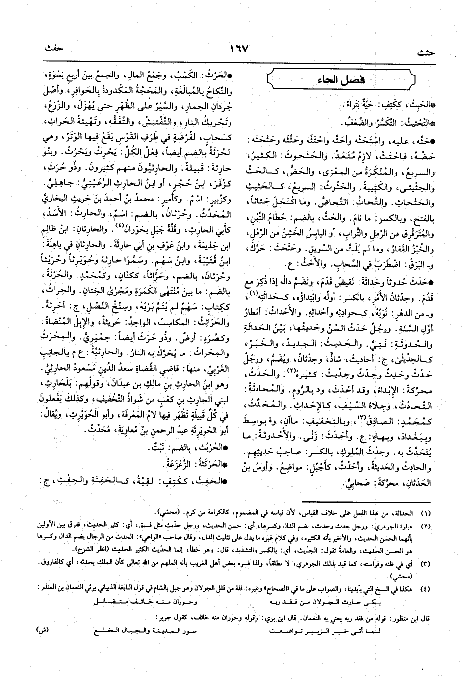 والحارِثيَّةُ: ع م بالجانِبِ الغَرْبِيِّ، منها: قاضي القُضاةِ سعدُ الدِّينِ مَسْعودٌ الحارِثِيُّ. وهو ابنُ الحارِثِ بنِ مالِكِ بن عبدَانَ، وقولُهم: بَلْحَارِثِ، لبنِي الحَارِثِ بنِ كعْبٍ من شَواذِّ التَّخْفيفِ، وكذلكَ يَفْعلونَ في كُلِّ قَبيلَةٍ تَظْهَر فيها لامُ المَعْرفة، وأبو الحُوَيْرِثِ، ويُقالُ: أبو الحُوَيْرِثَةِ عبدُ الرحمنِ بنُ مُعاوِيَةَ، مُحَدِّثٌ.