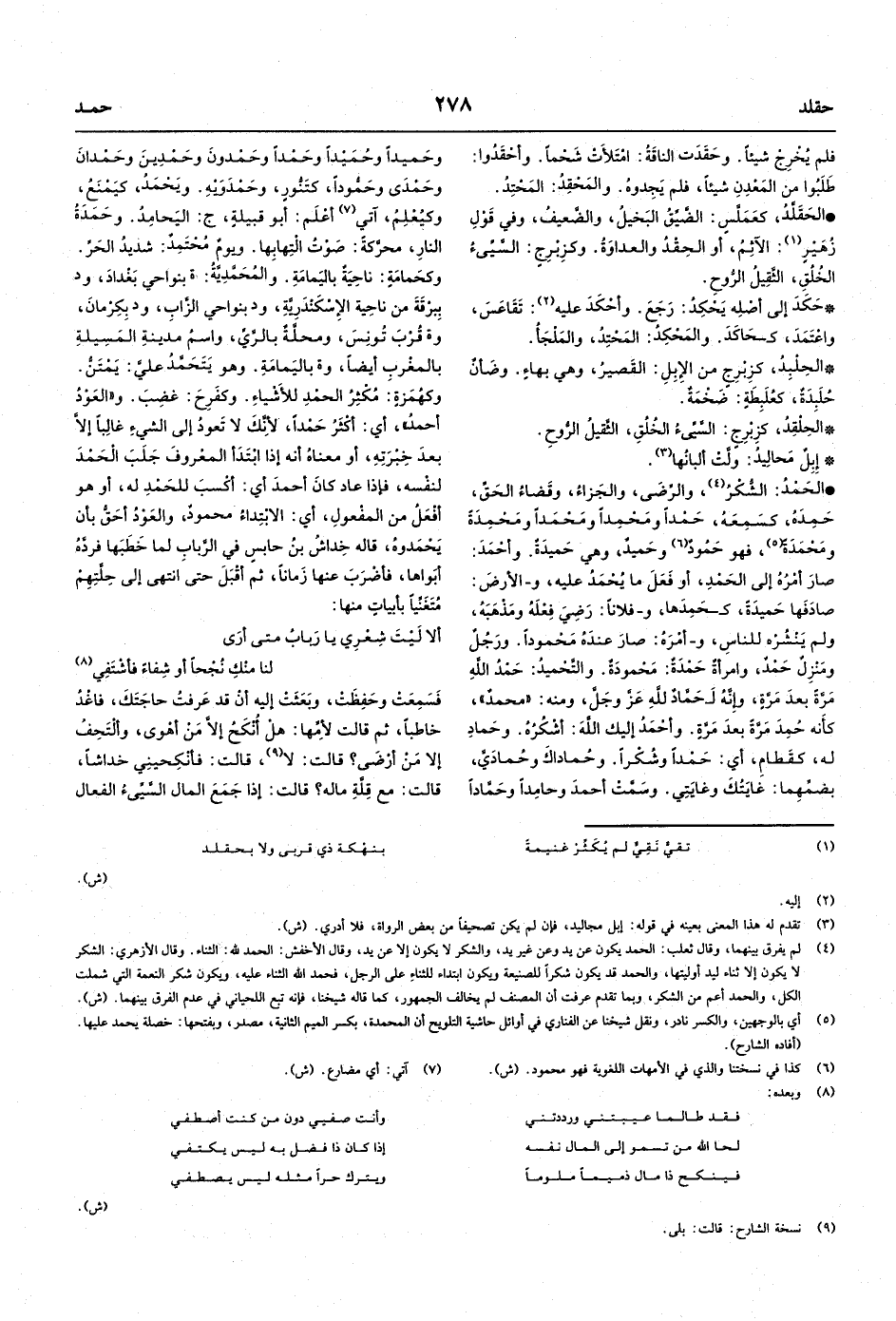 • الحَمْدُ: الشُّكْرُ، والرِّضى، والجَزاءُ، وقَضاءُ الحَقِّ،