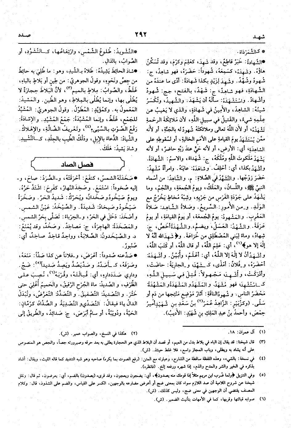 والشَّهيدُ، وتُكْسَرُ شينُهُ: الشاهِدُ، والأَمينُ في شَهادَةٍ، والذي لا يَغيبُ عن عِلْمِهِ شيءٌ، والقَتيلُ في سبيلِ الله،
