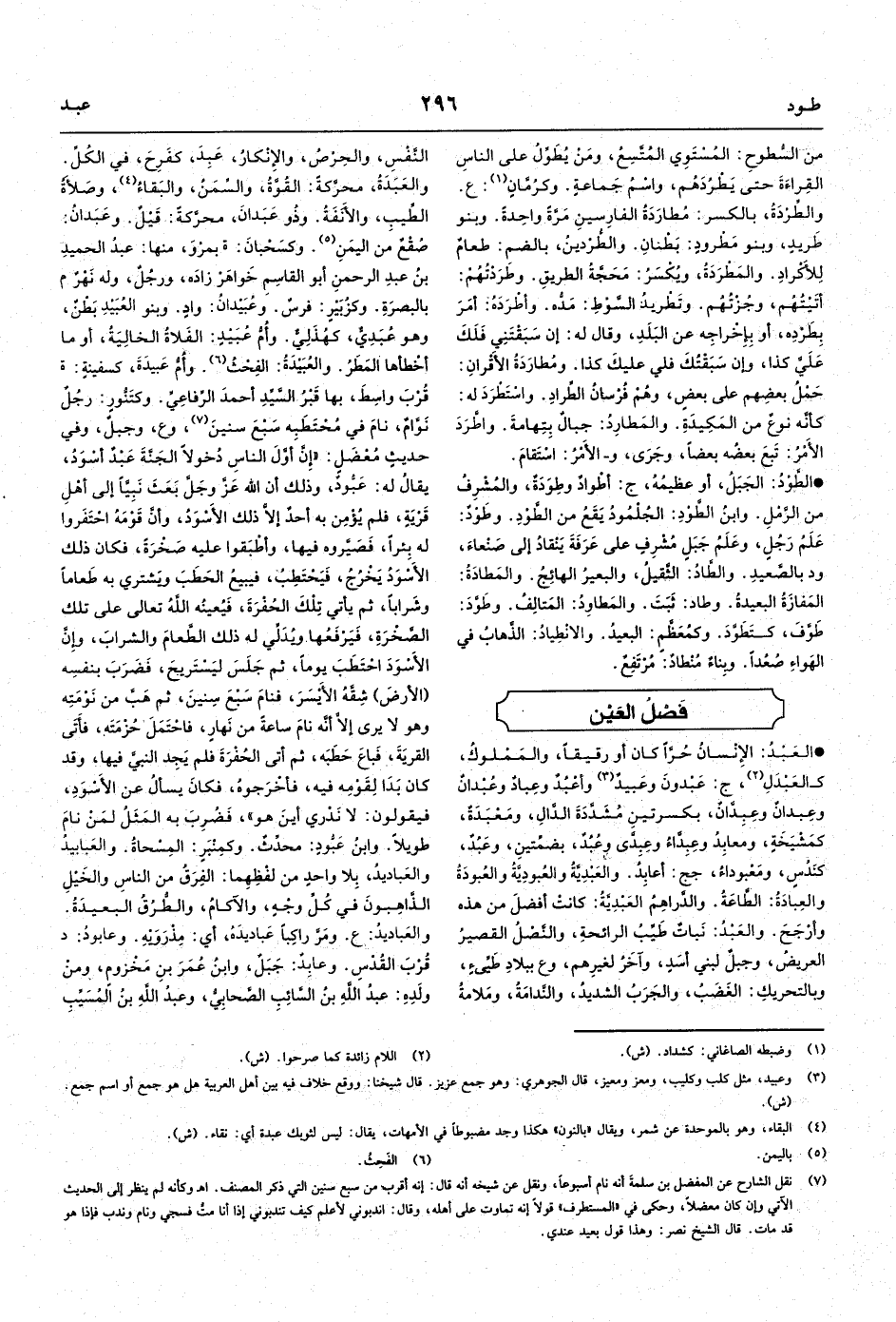 وع، وجبلٌ، وفي حديثٍ مُعْضَلٍ: "إِنَّ أوَّلَ الناسِ دُخولاً الجَنَّةَ عَبْدٌ أسْوَدُ، يقالُ له: عَبُّودٌ، وذلك أن الله عَزَّ وجَلَّ بَعَثَ نَبِيَّاً إلى أهْلِ قَرْيَةٍ، فلم يُؤْمِن به أحدٌ إلاَّ ذلك الأَسْوَدُ، وأنَّ قَوْمَهُ احْتَفَروا له بِئراً، فَصَيَّروه فيها، وأطْبَقوا عليه صَخْرَةً، فكان ذلك الأَسْوَدُ يَخْرُجُ، فَيَحْتَطِبُ، فيبيعُ الحَطَبَ ويَشتري به طَعاماً وشَراباً، ثم يأتي تِلْكَ الحُفْرَةَ، فَيُعينُه اللهُ تعالى على تلك الصَّخْرَةِ، فَيَرْفَعُها ويُدَلِّي له ذلك الطَّعامَ والشرابَ، وإِنَّ الأَسْوَدَ احْتَطَبَ يوماً، ثم جَلَسَ ليَسْتَريحَ، فَضَرَبَ بنفسِه (الأرضَ) شِقَّهُ الأَيْسَرَ، فنامَ سَبْعَ سِنينَ، ثم هَبَّ من نَوْمَتِه وهو لا يرى إلاَّ أنَّه نامَ ساعةً من نَهارٍ، فاحْتَمَلَ حُزْمَتَه، فأَتَى القريَةَ، فَباعَ حَطَبَه، ثم أتى الحُفْرَةَ فلم يَجِد النبيَّ فيها، وقد كان بَدَا لِقَوْمِه فيه، فأخْرَجوهُ، فكانَ يسألُ عن الأَسْوَدِ، فيقولون: لا نَدْري أينَ هو"، فَضُرِبَ به المثَلُ لمَنْ نامَ طويلاً.