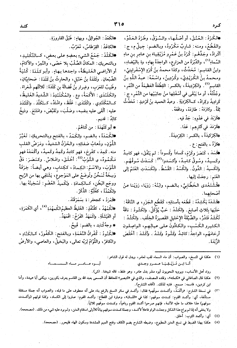 • الكَرْدُ: العُنُقُ، أو أصْلُها، والسَّوْقُ، وطَرْدُ العَدُوِّ، والقَطْعُ، ومنه: شارِبٌ مَكْرودٌ، وبالضم: جِيلٌ م، ج: أَكْرادٌ، وجَدُّهُم: كُرْدُ بنُ عَمْرٍو مُزَيْقِياءَ بنِ عامِرِ بنِ ماءِ السَّماءِ، والدَّبْرَةُ من المزارعِ، الواحِدَةُ بهاءٍ،