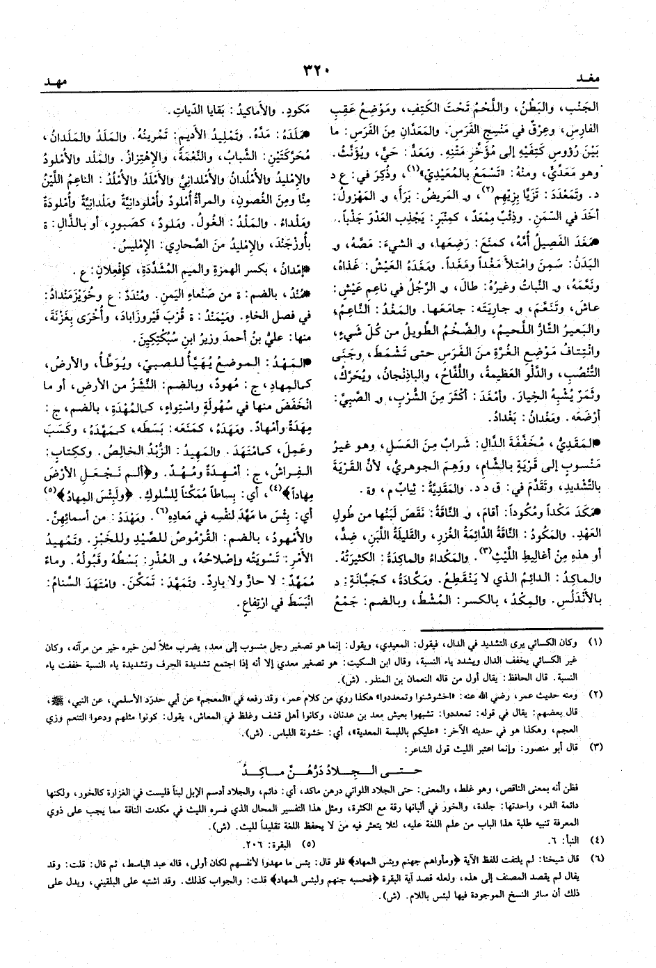 • المَهْدُ: الموضعُ يُهَيَّأُ للصبيِّ، ويُوَطَّأُ، والأرضُ، كالمِهادِ، ج: مُهودٌ، وبالضم: النَّشَزُ من الأرضِ، أو ما انْخَفَضَ منها في سُهُولَةٍ واسْتِواءٍ، كالمُهْدَةِ، بالضم، ج: مِهَدَةٌ وأمْهادٌ.
