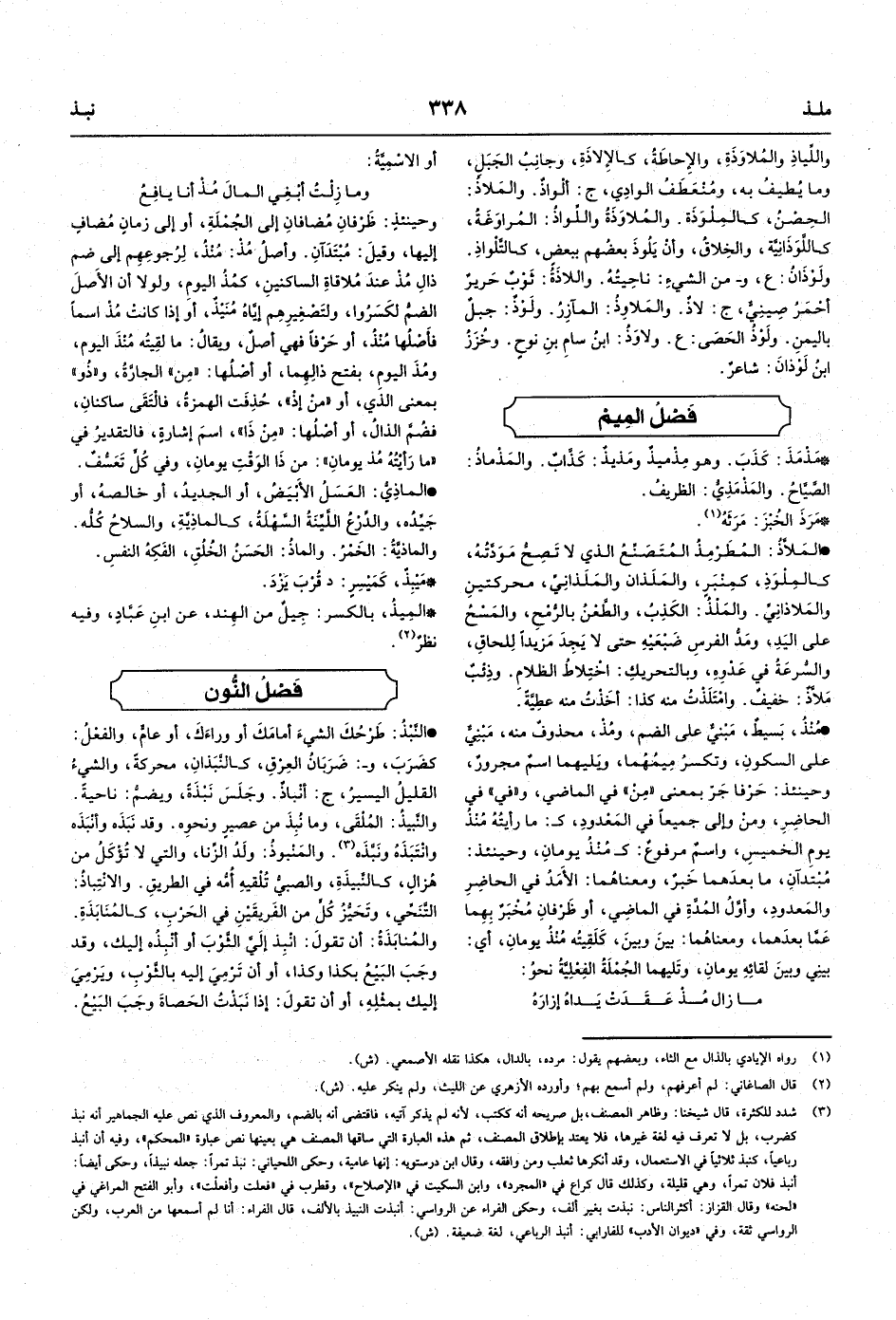 وأصلُ مُذْ: مُنْذُ، لِرُجوعِهِم إلى ضم ذالِ مُذْ عندَ مُلاقاةِ الساكنينِ، كمُذُ اليومِ، ولولا أن الأَصلَ الضمُّ لكَسَرُوا، ولتَصْغِيرِهِم إيَّاهُ
