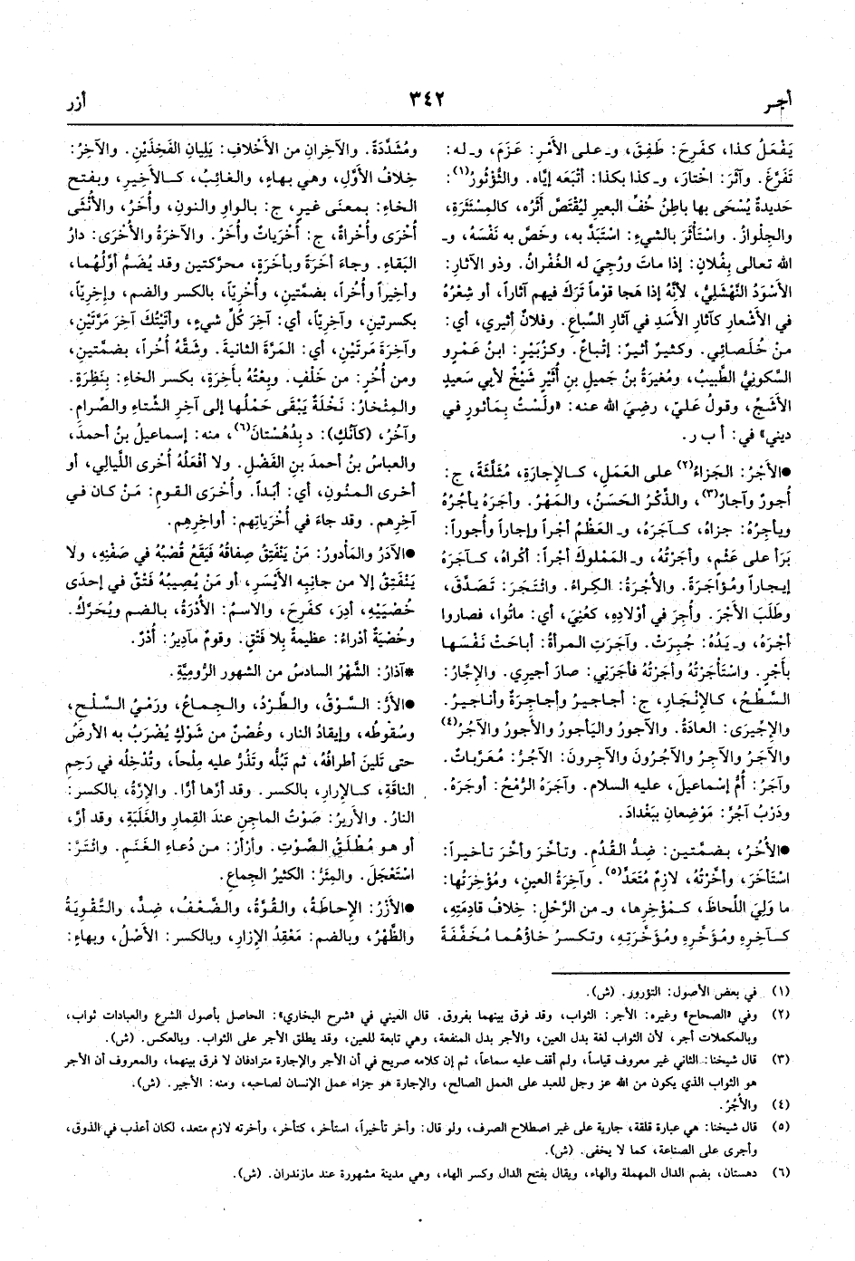 • الأَزْرُ: الإِحاطَةُ، والقُوَّةُ، والضَّعْفُ، ضِدٌّ، والتَّقْوِيَةُ والظَّهْرُ، وبالضم: مَعْقِدُ الإِزارِ، وبالكسر: الأصْلُ، وبهاءٍ: