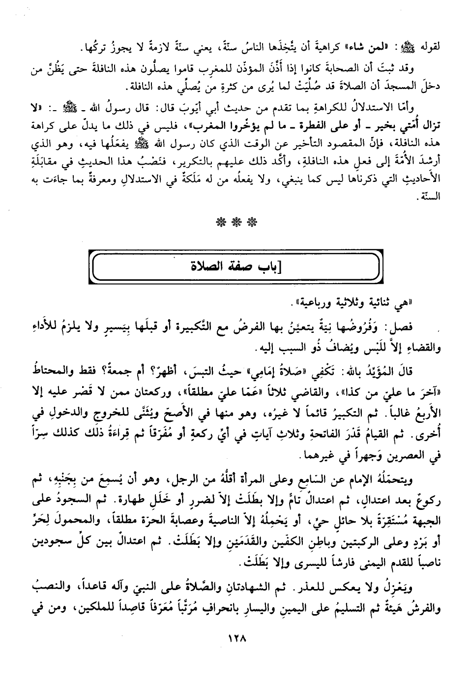 وأما الاستدلال للكراهة بما تقدم من حديث أبي أيوب قال قال رسول الله صلى الله عليه وسلم: "لا تزال أمتي بخير أو على الفطرة ما لم يؤخروا المغرب" فليس في ذلك ما يدل على كراهة هذه النافلة فإن المقصود التأخير عن الوقت الذي كان رسول الله صلى الله عليه وسلم يفعلها فيه وهو الذي أرشد الأمة إلي فعل هذه النافلة وأكد ذلك عليهم بالتكرير فنصب هذا الحديث في مقابلة الأحاديث التي ذكرناها ليس كما ينبغي ولا يفعله من له ملكة في الاستدلال ومعرفة بما جاءت به السنة.