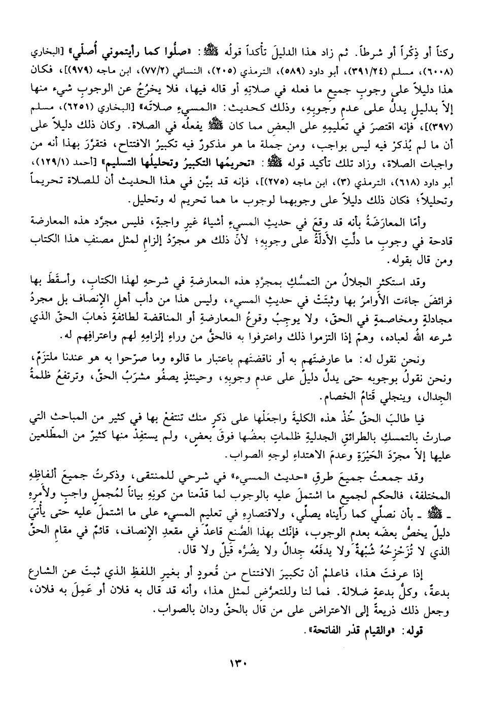 وأما المعارضة بأنه قد وقع في حديث المسيء اشياء غير واجبة فليس مجرد هذه المعارضة قادحة في وجوب ما دلت الأدلة على وجوبه لأن ذلك هو مجرد إلزام لمثل مصنف هذا الكتاب ومن قال بقوله.