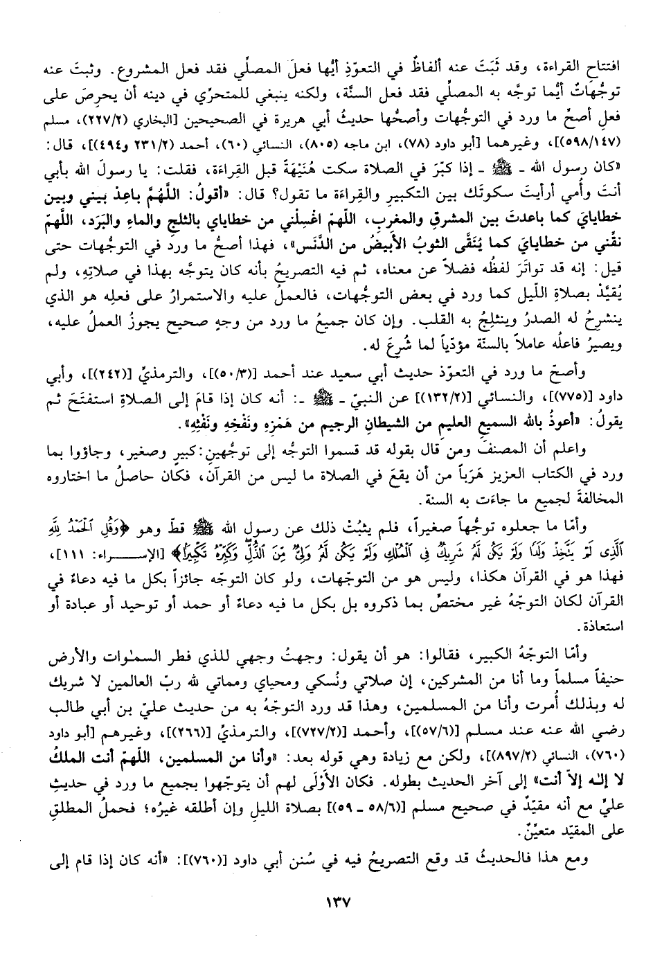 وأما التوجه الكبير فقالوا هو أن يقول وجهت وجهي للذي فطر السمأوات والأرض حنيفا مسلما وما أنا من المشركين إن صلاتي ونسكي ومحياي ومماتي لله رب العالمين لا شريك له وبذلك امرت وأنا من المسلمين وهذا وقد ورد التوجه به من حديث علي بن أبي طالب رضي الله عنه عند مسلم ["6/57"، وأحمد ["2/727"، والترمذي ["266"] ، وغيرهم [أبو دأود "760"، النسائي "2/897"] ، ولكن مع زيادة وهو قوله بعد "وأنا من المسلمين اللهم أنت الملك لا إله إلا أنت" إلي آخر الحديث بطولة فكان الأولى لهم أن يتوجهوا بكل ما ورد في حديث على مع أنه مقيد في صحيح مسلم بصلاة الليل وإن اطلقه غيره فحمل المطلق على المقيد متعين.