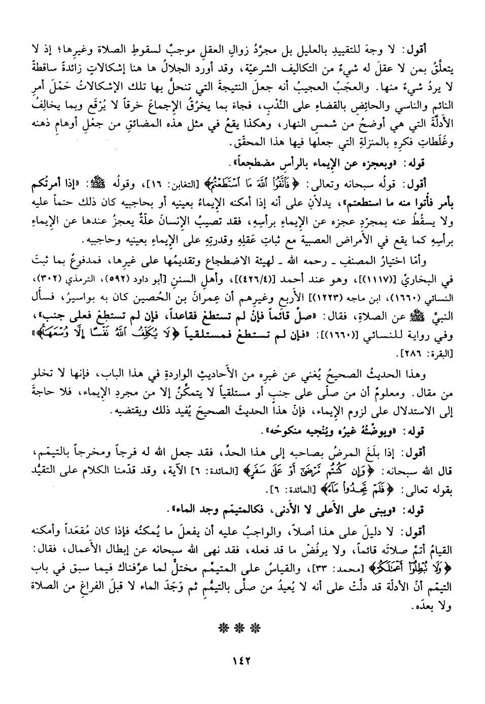 أقول: قوله سبحانه وتعالي: {فَاتَّقُوا اللَّهَ مَا اسْتَطَعْتُمْ} [التغابن: 16] ، وقوله صلى الله عليه وسلم: "إذا أمرتكم بأمر فاتوا منه ما استطعتم" يدلان على أنه إذا أمكنه الايماء بعينيه أو بحاجبيه كان ذلك حتما عليه ولا يسقط عنه بمجرد عجزه عن الإيماء برأسه فقد تصيب الإنسان علة يعجز عندها عن الايماء برأسه كما يقع في الأمراض العصبية مع ثبات عقله وقدرته على الايماء بعينيه وحاجبيه.