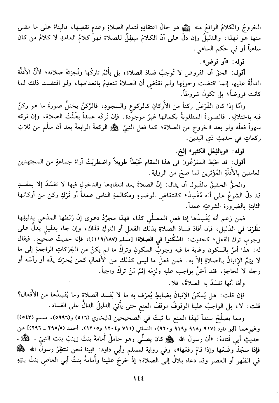 فمن زعم أنه يفسدها إذا فعل المصلي كذا فهذا مجرد دعوى إن ربطها المدعي بدليلها نظرنا في الدليل فإن أفاد فساد الصلاة بذلك الفعل أو الترك فذاك وإن جاء بدليل يدل على وجوب ترك الفعل كحديث "اسكنوا في الصلاة" [مسلم "87/119"] ، فإنه حديث صحيح فيقال له هذا أمر بالسكون وغاية ما فيه وجوب السكون وترك ما لم يكن من الحركات الراجعة إلي ما لا يتم الإتيان بالصلاة إلا به فمن فعل ما ليس كذلك من الأفعال كمن يحرك يده أو رأسه أو رجله لا لحاجة فقد أخل بواجب عليه ولزمه إثم من ترك واجبا.