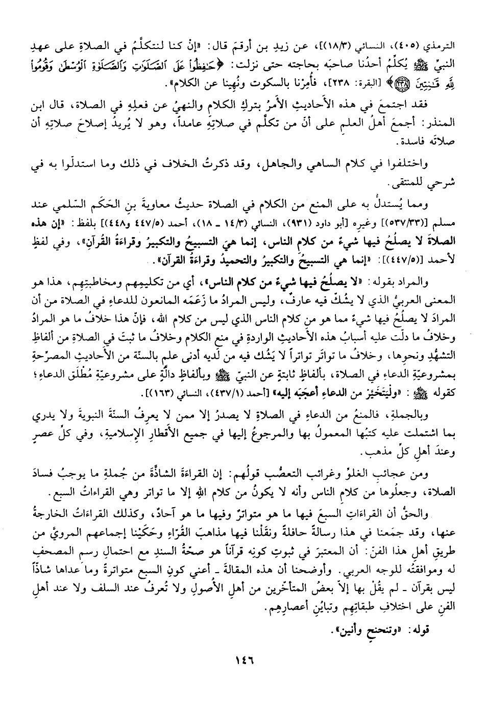 والمراد بقوله: "لا يصلح فيها شيء من كلام الناس" أي من تكليمهم ومخاطبتهم هذا هو المعنى العربي الذي لا يشك فيه عارف وليس المراد ما زعمه المانعون للدعاء في الصلاة من أن المراد لا يصلح فيها شيء مما هو من كلام الناس الذي ليس من كلام الله فإن هذا خلاف ما هو المراد وخلاف ما دلت عليه أسباب هذه الأحاديث الواردة في منع الكلام وخلاف ما ثبت في الصلاة من ألفاظ التشهد ونحوها وخلاف ما تواتر تواترا لا يشك فيه من لديه أدنى علم بالسنة من الأحاديث المصرحة بمشروعية الدعاء في الصلاة بألفاظ ثابتة عن النبي صلى الله عليه وسلم وبألفاظ دالة على مشروعية مطلق الدعاء كقوله صلى الله عليه وسلم: "وليتخير من الدعاء أعجبه إليه" [أحمد "1/437"، النسائي "163"] .