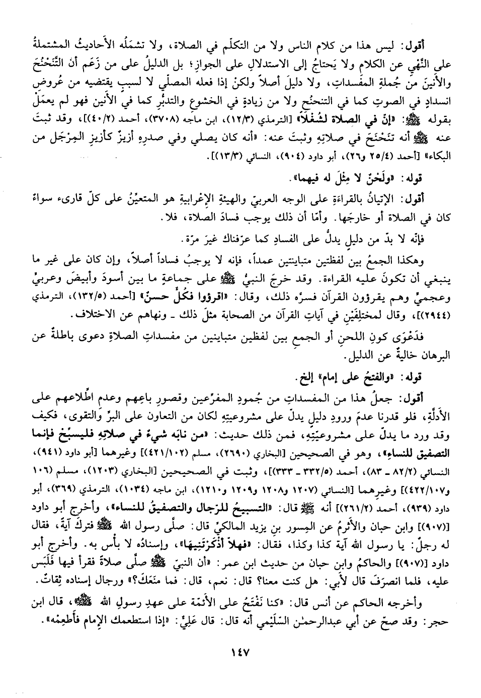 أقول: ليس هذا من كلام الناس ولا من التكلم في الصلاة ولا تشمله الأحاديث المشتملة على النهي عن الكلام ولا يحتاج إلي الاستدلال على الجواز بل الدليل على من زعم أن التنحنح والأنين من جملة المفسدات ولا دليل أصلا ولكن إذا فعله المصلي لا لسبب يقتضيه من عروض إنسداد في الصوت كما في التنحنح ولا من زيادة من الخشوع والتدبر كما في الأنين فهو لم يعمل بقوله صلى الله عليه وسلم: "إن في الصلاة لشغلا" [الترمذي "3/12"، ابن ماجة "2708"، أحمد "2/40"، وقد ثبت عنه صلى الله عليه وسلم أنه تنحنح في صلاته وثبت عنه أنه كان يصلي وفي صدره أزيز كأزيز المرجل من البكاء. [أحمد "4/25، 26"، أبو دأود "904"، النسائي "3/13"] .