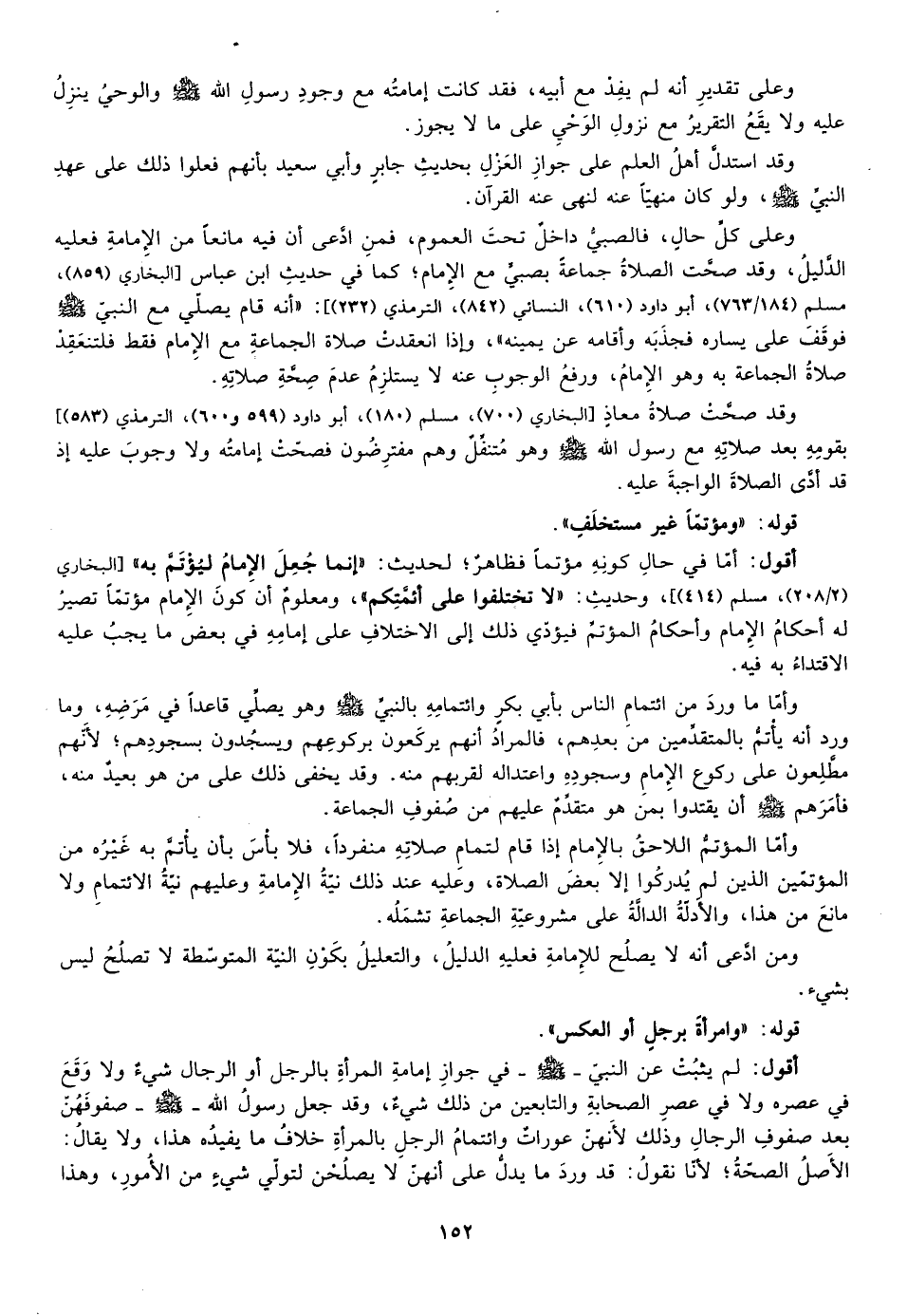وعلى كل حال فالصبي داخل تحت العموم فمن ادعى أن فيه مانعا من الإمامة فعليه الدليل وقد صحت الصلاة جماعة بصبي مع الإمام كما في حديث ابن عباس [البخاري "859"، مسلم "184، 763"، أبو دأود "610"، النسائي "842"، الترمذي "232"] : "أنه قام يصلي مع النبي صلى الله عليه وسلم فوقف على يساره فجذبه وأقامه عن يمينه" وإذا انعقدت صلاة الجماعة مع الإمام فقط فلتنعقد صلاة الجماعة به وهو الإمام ورفع الوجوب عنه لا يستلزم عدم صحة صلاته.