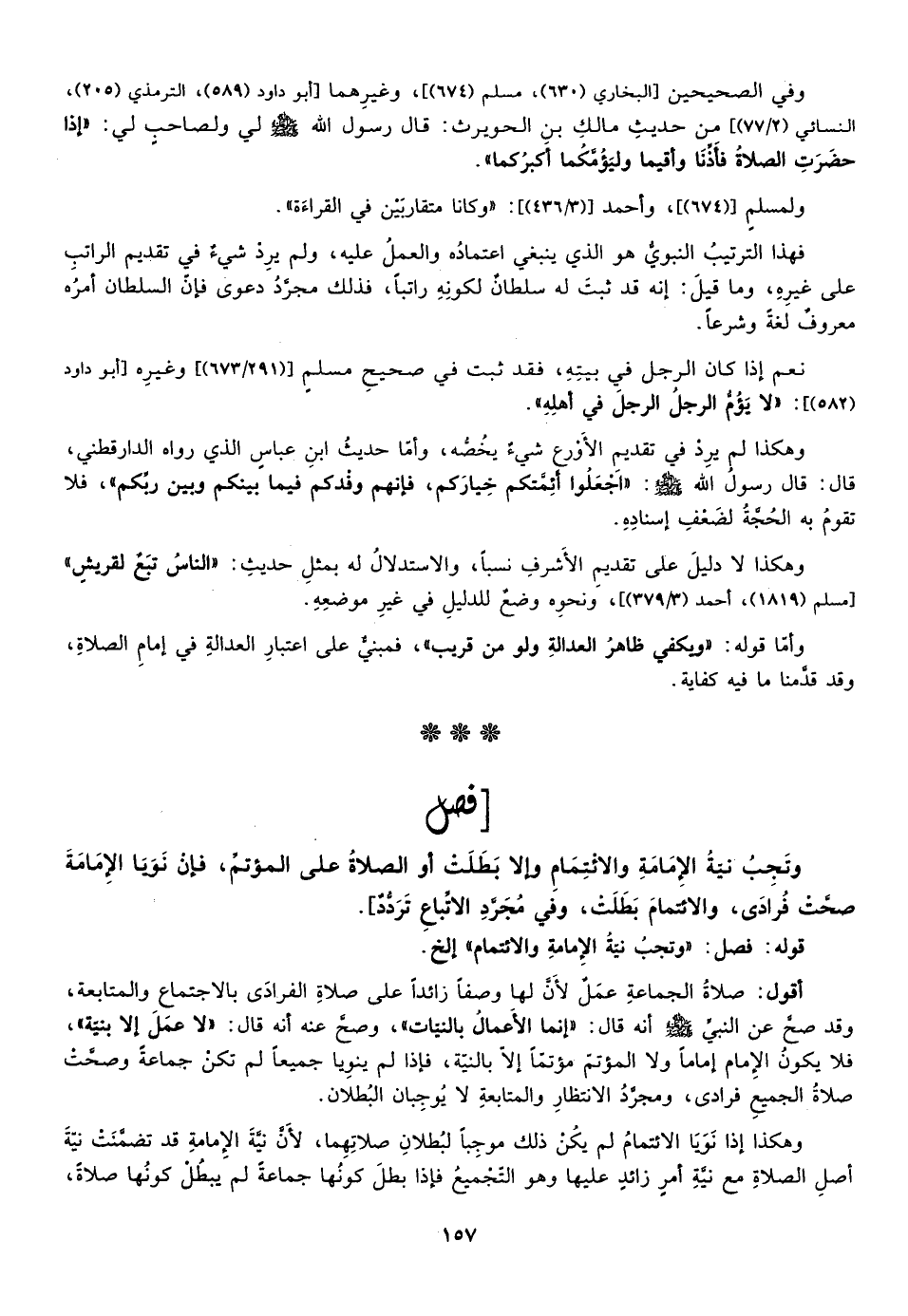 وفي الصحيحين [البخاري "630"، مسلم "674"، وغيرهما [أبو دأود "589"، الترمذي "205"، النسائي "2/77"] من حديث مالك بن الحويرث قال قال رسول الله صلى الله عليه وسلم لي ولصاحب لي: "إذا حضرت الصلاة فأذنا وأقيما وليؤمكما أكبركما".