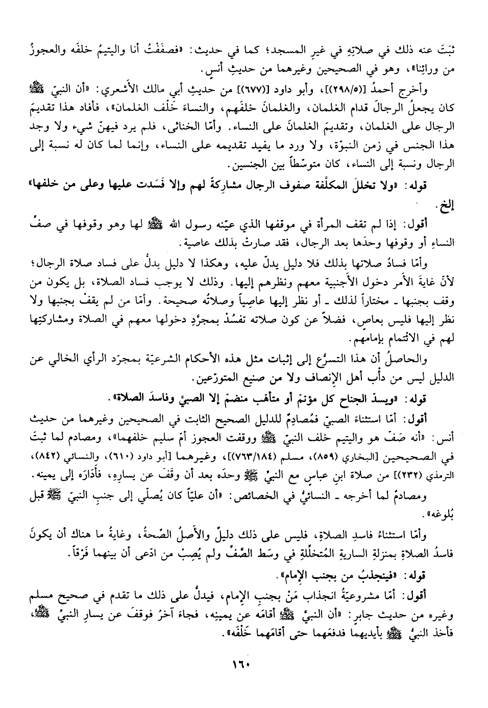 أقول: أما استثناء الصبي فمصادم للدليل الصحيح الثابت في الصحيحين وغيرهما من حديث أنس أنه صف هو واليتيم خلف النبي صلى الله عليه وسلم ووقفت العجوز أم سليم خلفهما ومصادم لما ثبت في الصحيحين [البخاري "859"، مسلم "184/763"] ، وغيرهما [أبو دأود "610"، والنسائي "842"، الترمذي "232"، من صلاة ابن عباس مع النبي صلى الله عليه وسلم وحده بعد أن وقف عن يساره فأداره إلي يمينه