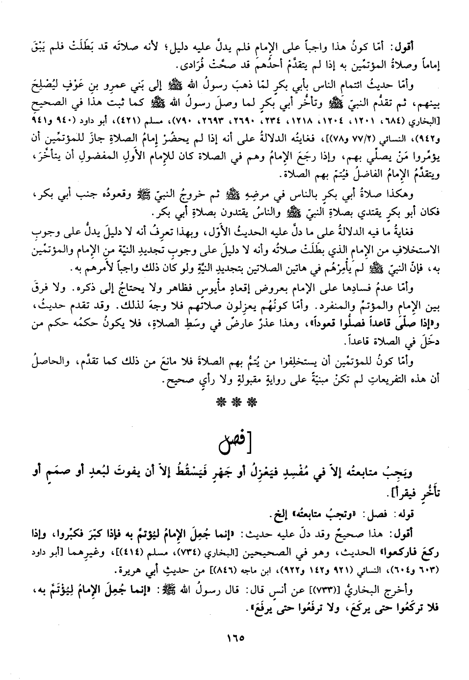 وأما حديث ائتمام الناس بأبي بكر لما ذهب رسول الله صلى الله عليه وسلم إلي بني عمرو بن عوف ليصلح بينهم ثم تقدم النبي صلى الله عليه وسلم وتأخر أبي بكر لما وصل رسول الله صلى الله عليه وسلم كما ثبت هذا في الصحيح [البخاري "684، 1201، 1218، 234، 2690، 2693، 790"، مسلم "421"، أبو دأود "940، 941، 942، النسائي "2/77، 78"] ، فغايته الدلالة على أنه إذا لم يحضر إمام الصلاة جاز للمؤتمين أن يؤمروا من يصلي بهم وإذا رجع الإمام وهم في الصلاة كان لللإمام الأول المفضول أن يتأخر ويتقدم الإمام الفاضل فيتم بهم الصلاة.