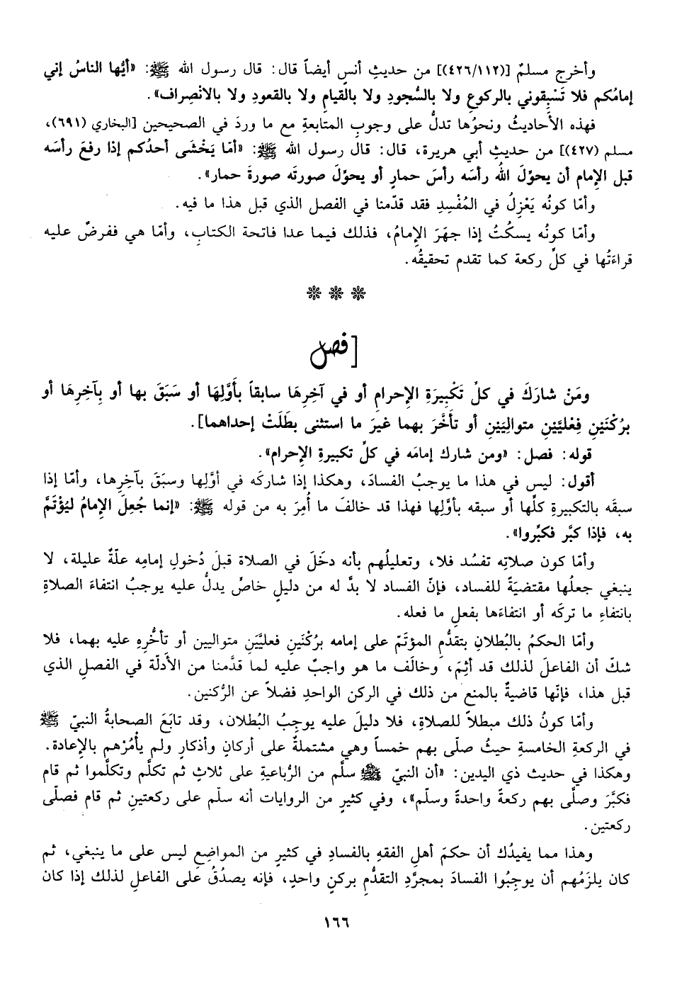 وأخرج مسلم ["112/426"] ، من حديث أنس أيضا قال قال رسول الله صلى الله عليه وسلم: "أيها الناس إني إمامكم فلا تسبقوني بالركوع ولا بالسجود ولا بالقيام ولا بالقعود ولا بالانصراف".