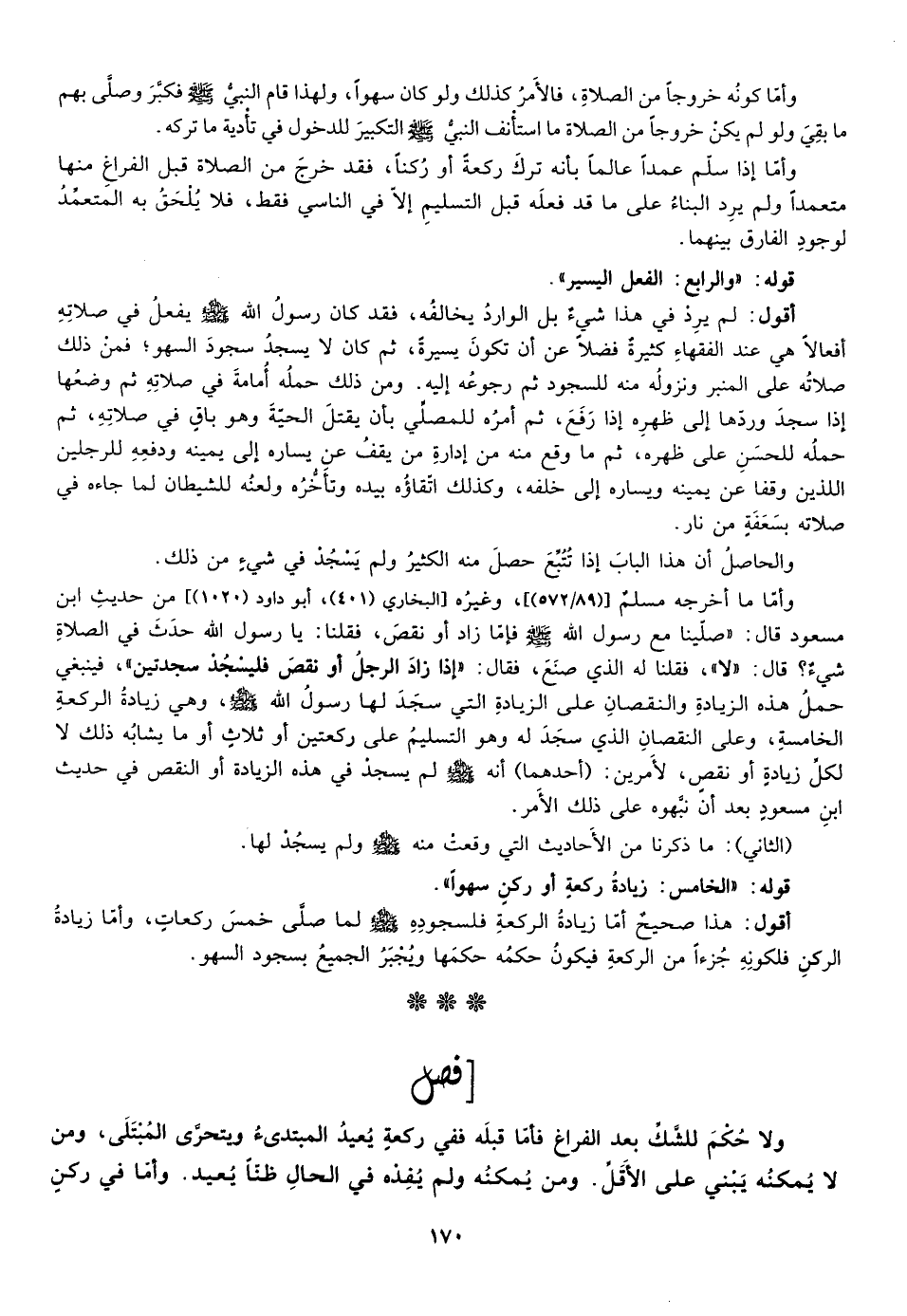 وأما ما أخرجه مسلم ["89/ 572"، وغيره [البخاري""401"، أبو دأود "1020"] ، من حديث ابن مسعود قال: صلينا مع رسول الله صلى الله عليه وسلم فإما زاد أو نقص علينا فقلنا: يا رسول الله حدث في الصلاة شيء؟ قال: "لا" فقلنا له الذي صنع فقال: "إذا زاد الرجل أو نقص فليسجد سجدتين" فينبغي حمل هذه الزيادة أو النقصان على الزيادة التي سجد لها رسول الله صلى الله عليه وسلم وهي زيادة الركعة الخامسة وعلى النقصان الذي سجد له وهو التسليم على ركعتين أو ثلاث أو ما يشابه ذلك لا لكل زيادة أو نقص لأمرين أحدهما أنه صلى الله عليه وسلم لم يسجد في هذه الزيادة أو النقص في حديث ابن مسعود بعد اأن نبهوه على ذلك الأمر.
