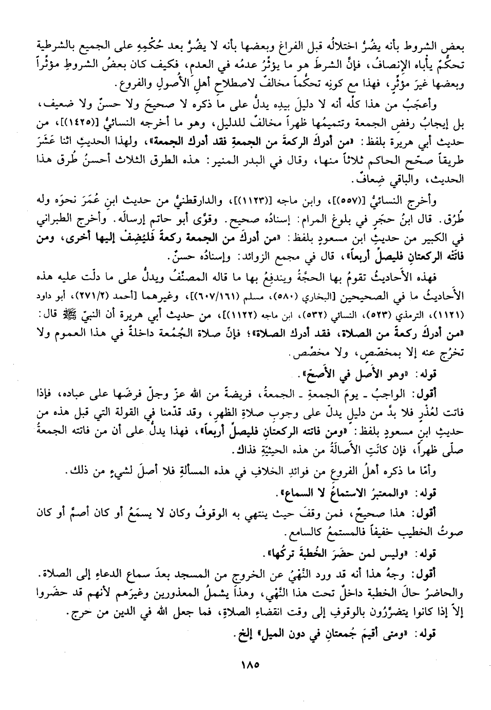 وأعجب من هذا كله أنه لا دليل بيده يدل على ما ذكره لا صحيح ولا حسن ولا ضعيف بل إيجاب رفض الجمعة وتتميمها ظهرا مخالف للدليل وهو ما أخرجه النسائي ["1425"] ، من حديث أبي هريرة بلفظ: "من أدرك من الجمعة فقد أدرك الجمعة" ولهذا الحديث اثنا عشر طريقا صحح الحاكم منها ثلاثا وقال في البدر المنير هذه الطرق الثلاث أحسن طرق هذا الحديث والباقي ضعاف.
