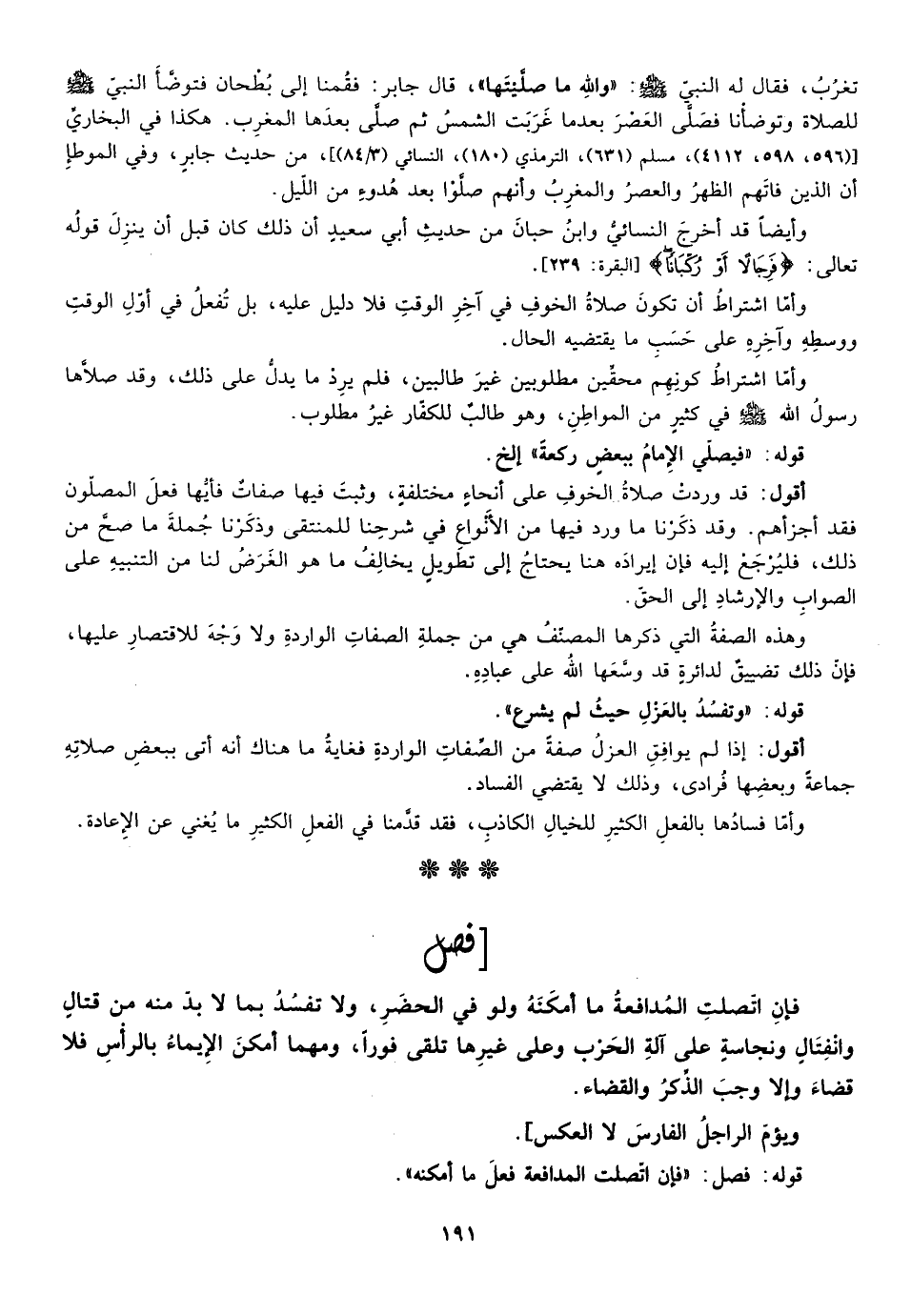 وأما اشتراط أن تكون صلاة الخوف في آخر الوقت فلا دليل عليه بل تفعل في أول الوقت ووسطه وآخره على حسب ما يقتضيه الحال.