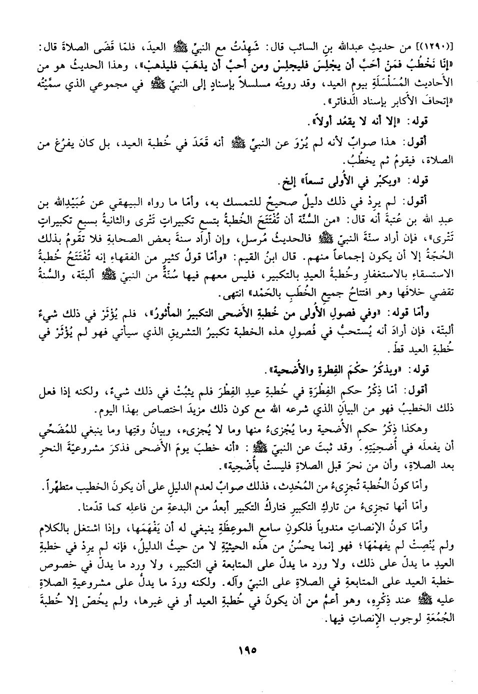 "1290"] ، من حديث عبد الله بن السائب قال شهدت مع النبي صلى الله عليه وسلم العيد فلما قضى الصلاة قال: "إنا نخطب فمن أحب أن يجلس فليجلس ومن أحب أن يذهب فليذهب"، وهذا الحديث هو من الأحاديث المسلسلة بيوم العيد وقد رويته مسلسلا بإسناد إلي النبي صلى الله عليه وسلم في مجموعي الذي سميته إتحاف الأكابر بإسناد الدفاتر".