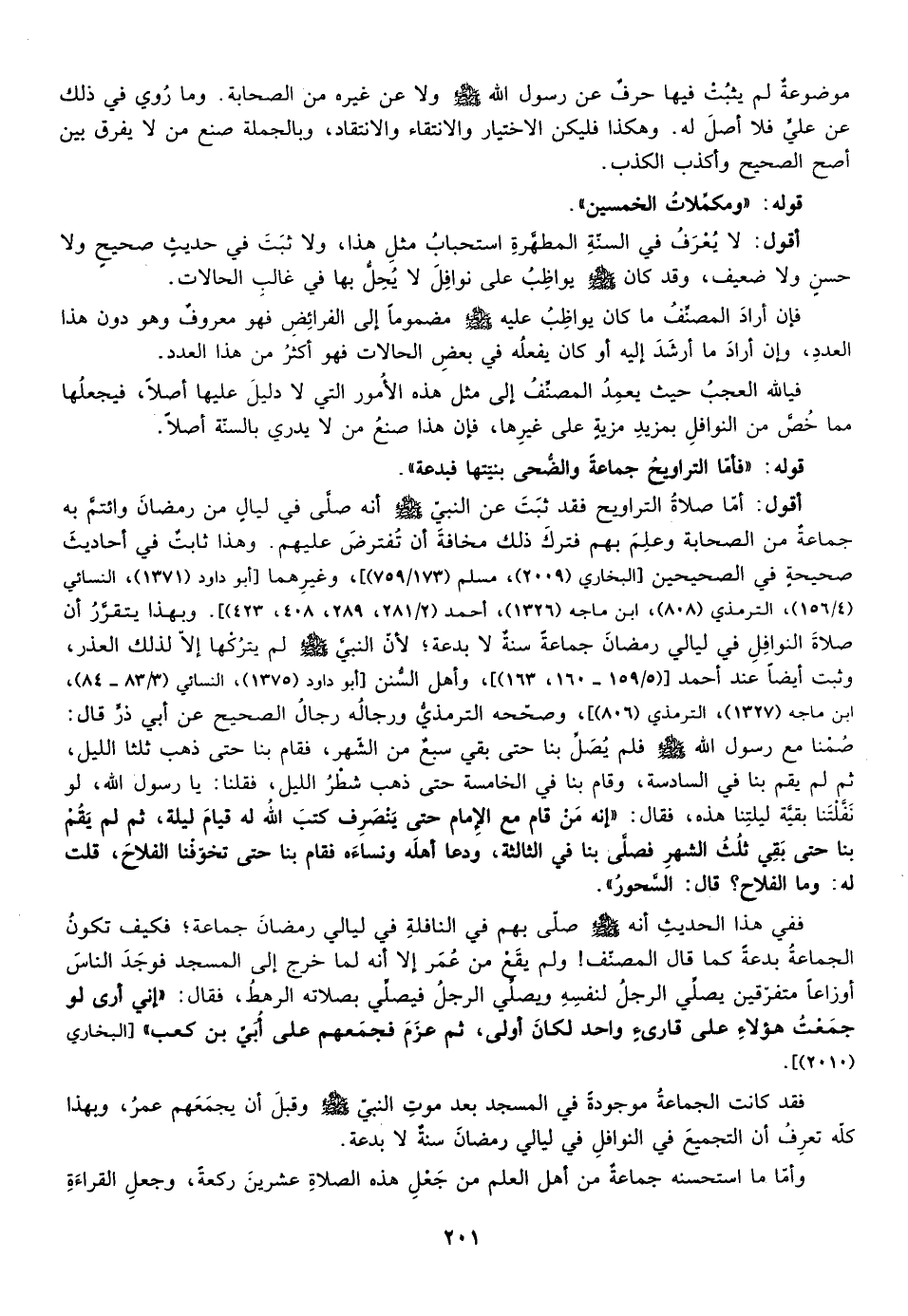 أقول: أما صلاة الترأويح فقد ثبت عن النبي صلى الله عليه وسلم أنه صلى في ليال من رمضان وائتم به جماعة من الصحابة وعلم بهم فترك ذلك مخافة أن تفترض عليهم وهذا ثابت في أحاديث صحيحة في الصحيحين [البخاري "2009"، مسلم "173/759"، وغيرهما [ابو دأود "1371"، النسائي "4/156"، الترمذي "808"، ابن ماجة "1326"، أحمد "2/281، 289، 408، 423"] ، وبهذا يتقرر أن صلاة النوافل في ليالي رمضان جماعة سنة لا بدعة لأن النبي صلى الله عليه وسلم لم يتركها إلا لذلك العذر وثبت أيضا عند أحمد ["5/159، 160، 163"] ، وأهل السنن أبو دأود "1375"، النسائي ""3/83، 84"، "ابن ماجة 1327"، الترمذي 806"] ، وصححه الترمذي ورجاله رجال الصحيح عن أبي ذر قال صمنا مع رسول الله صلى الله عليه وسلم فلم يصل بنا حتى مضى سبع من الشهر فقام بنا حتى ذهب ثلثا الليل ثم لم يقم بنا في السادسة وقام بنا في الخامسة حتى ذهب شطر الليل فقلنا: يا رسول الله لو نفلتنا بقية ليلتنا هذه فقال: "إنه من قام مع الإمام حتى يتصرف كتب له قيام ليلة" ثم لم يقم بنا حتى بقي ثلث الشهر فصلى بنا في الثالثة ودعا أهله ونساءه فقام بنا حتى تخوفنا الفلاح, قلت له: وما الفلاح؟ قال: السحور.