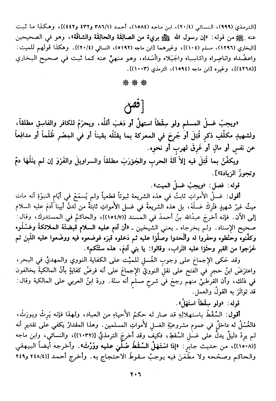 ويجب غسل المسلم ولو سقطا استهل أو ذهب اقله ويحرم للكافر والفاسق مطلقا ولشهيد مكلف ذكر قتل أو جرح في المعركة بما يقتله يقينا أو في المصر ظلما أو مدافعا عن نفس أو مال أو غرق لهرب أو نحوه.