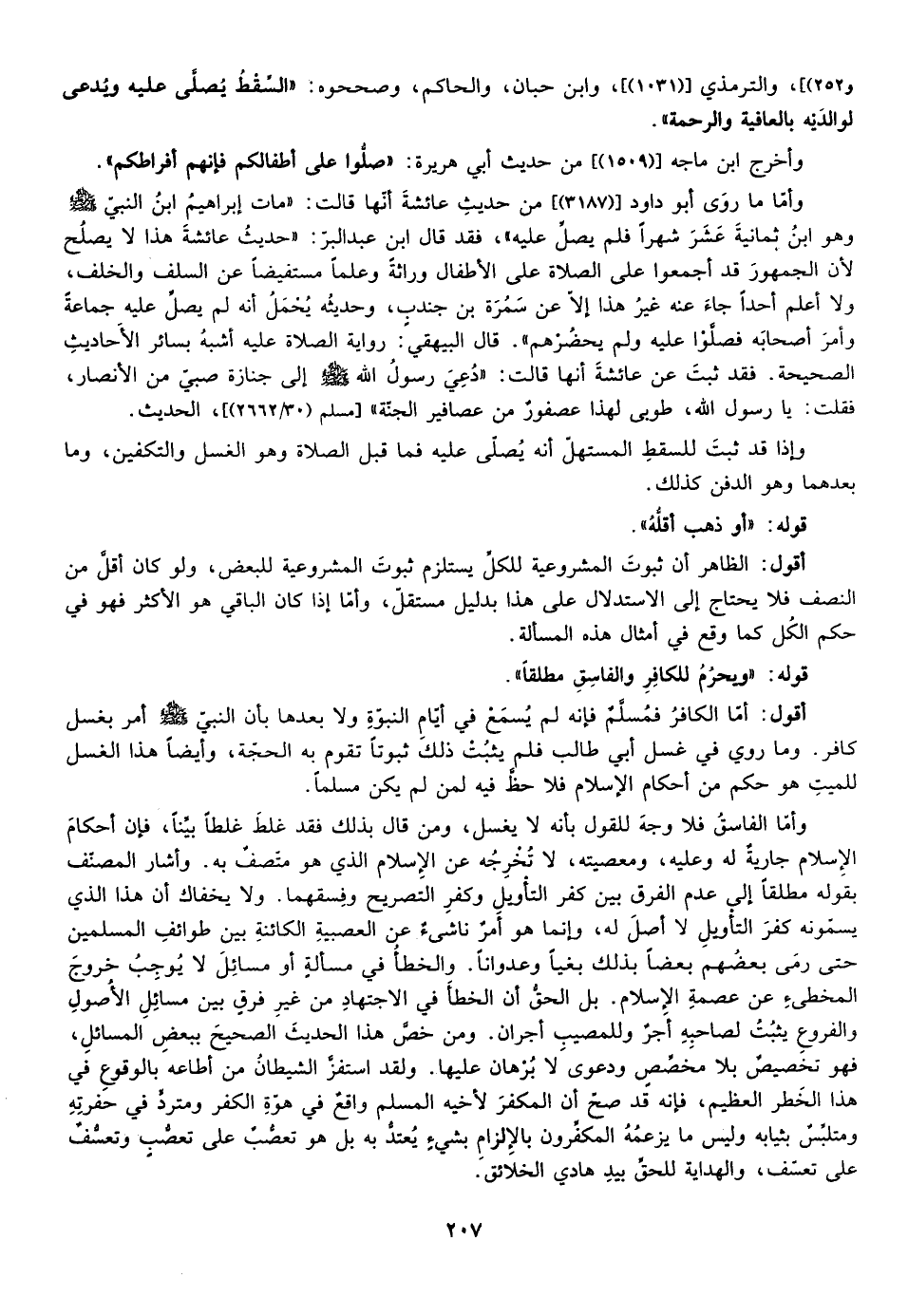وأما ما روى أبو دأود ["3187"] ،من حديث عائشة أنها قالت مات إبراهيم ابن النبي صلى الله عليه وسلم وهو ابن ثمانية عشر شهرا فلم يصل عليه فقد قال ابن عبد البر حديث عائشة هذا لا يصلح لأن الجمهور قد أجمعوا على الصلاة وراثة وعلما مستفيضا عن السلف والخلف ولا أعلم احدا جاء عنه غير هذا إلا عن سمرة بن جندب وحديثه يحمل أنه لم يصل عليه جماعة وأمر أصحابه فصلوا عليه ولم يحضرهم قال البيهقي رواية الصلاة عليه أشبه بسائر الأحاديث الصحيحة فقد ثبت عن عائشة أنها قالت "دعي رسول الله صلى الله عليه وسلم إلي جنازة صبي من الأنصار فقلت يا رسول الله طوبى لهذا عصفور من عصافير الجنة" [مسلم "30/2662"] ، الحديث.