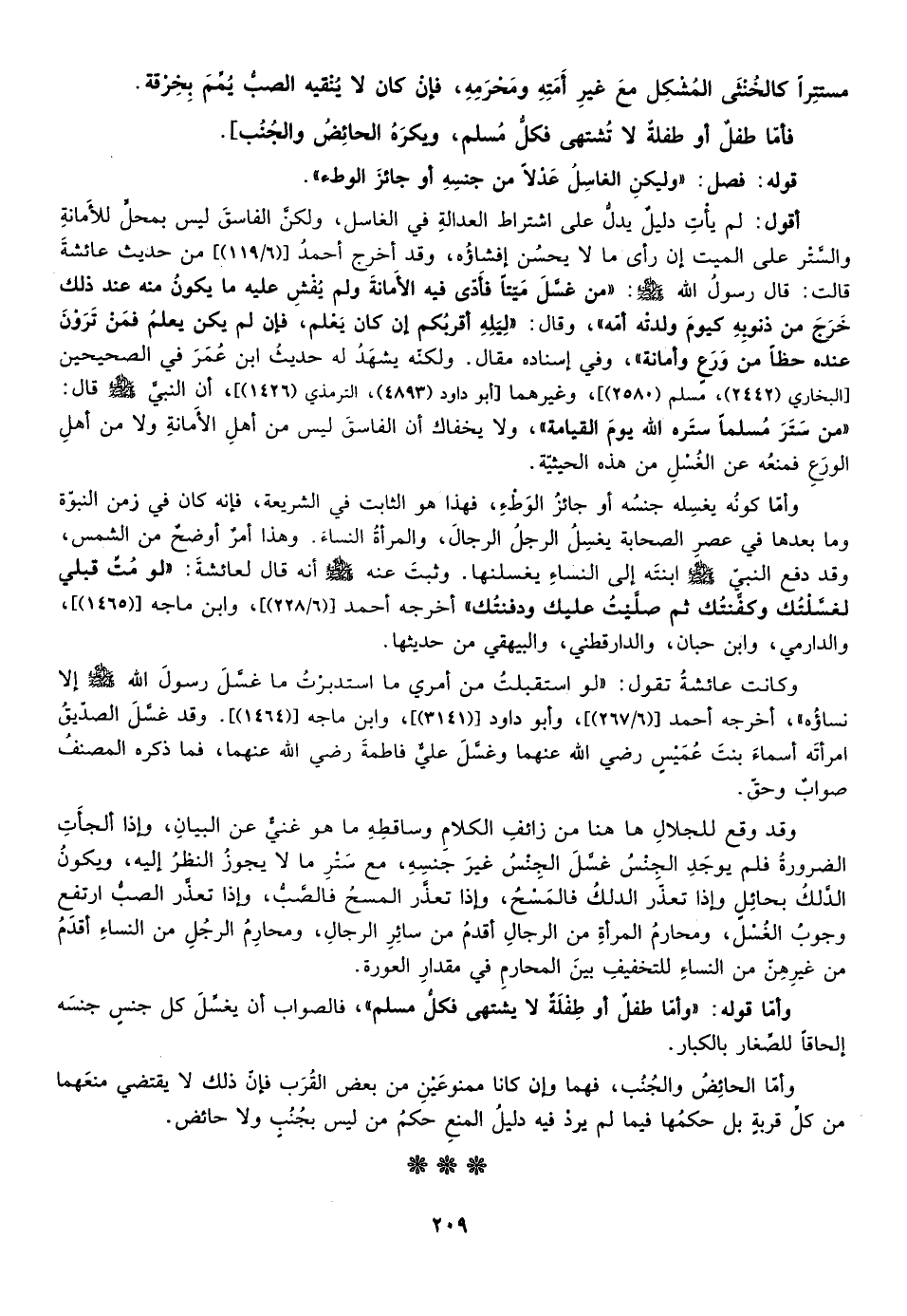 وأما كونه يغسله جنسه أو جائز الوطء فهذا هو الثابت في الشريعة فإنه كان في زمن النبوة وما بعدها في عصر الصحابة يغسل الرجل الرجال والمرأة النساء وهذا أمر أوضح من الشمس وقد دفع النبي صلى الله عليه وسلم ابنته إلي النساء يغسلنها وثبت عنه صلى الله عليه وسلم أنه قال لعائشة: "لو مت قبلي لغسلتك وكفنتك ثم صليت عليك ودفنتك"، أخرجه أحمد ["6/228"، وابن ماجة "1465"] ،والدارمي وابن حبان والدارقطني والبيهقي من حديثها.