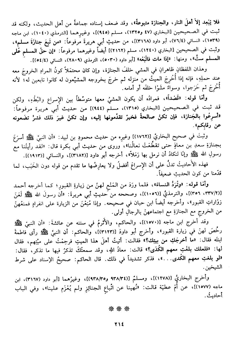 وأخرج البخاري "1278"، ومسلم "34/938، 35/938"، وغيرهما [أبو دأود "3167"، ابن ماجة "1577"] ، عن أم عطية قالت نهينا عن اتباع الجنائز ولم يعزم علينا وفي الباب أحاديث.
