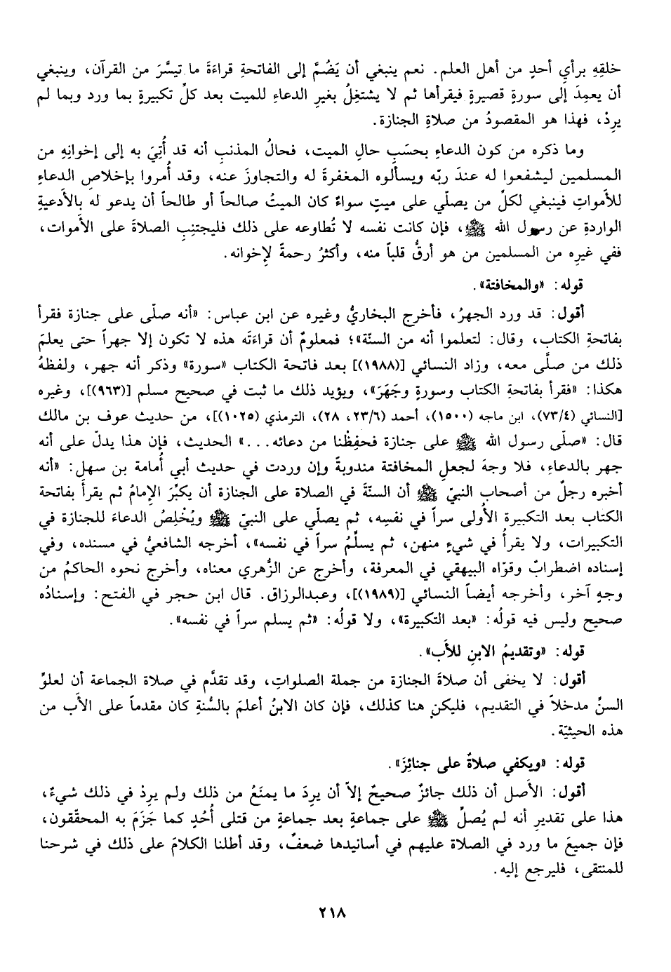 أقول: قد ورد الجهر فأخرج البخاري وغيره عن ابن عباس أنه صلى على جنازة فقرأ بفاتحة الكتاب وقال لتعلموا أنه من السنة فمعلوم أن قراءته هذه لا تكون إلا جهرا حتى يعلم ذلك من صلى معه وزاد النسائي ["1988"] ، بعد فاتحة الكتاب سورة وذكر أنه جهر ولفظه هكذا فقرأ بفاتحة الكتاب وسورة وجهر ويؤيد ذلك ما ثبت في صحيح مسلم ["963"] ، وغيره [النسائي "4/73"، ابن ماجة "1500" أحمد "6/23، 28"، الترمذي "1025"] ، من حديث عوف بن مالك قال صلى رسول الله صلى الله عليه وسلم على جنازة فحفظنا من دعائه الحديث فإن هذا يدل على أنه جهر بالدعاء فلا وجه لجعل المخافتة مندوبة وإن وردت في حديث أبي أمامة بن سهل أنه أخبره رجل من أصحاب النبي صلى الله عليه وسلم أن السنة في الصلاة على الجنازة أن يكبر الإمام ثم يقرأ بفاتحة الكتاب بعد التكبيرة سرا في نفسه ثم يصلي على النبي صلى الله عليه وسلم ويخلص الدعاء للجنازة في التكبيرات ولا يقرأ في شيء منهن ثم يسلم سرا في نفسه أخرجه الشافعي في مسنده وفي إسناده اضطراب وقواه البيهقي في المعرفة وأخرج عن الزهري معناه وأخرج نحوه الحاكم من وجه آخر وأخرجه أيضا النسائي وعبد الرزاق قال ابن حجر في الفتح وإسناده صحيح وليس فيه قوله بعد التكبيرة ولا قوله ثم يسلم سرا في نفسه.
