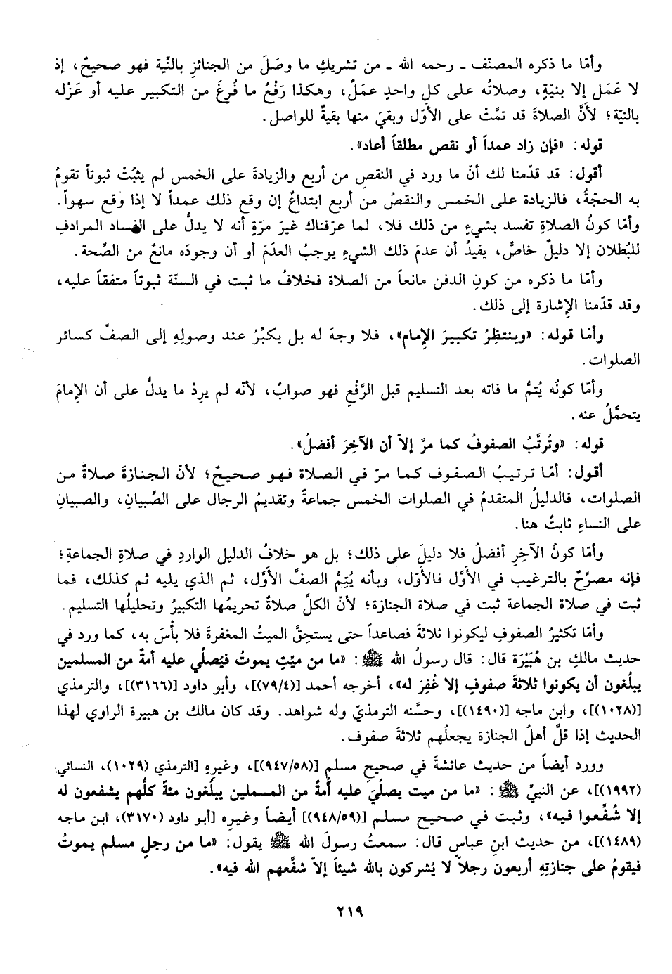 وأما كون الآخر أفضل فلا دليل عليه بل هو خلاف الدليل الوارد في صلاة الجماعة فإنه مصرح بالترغيب في الأول وبأنه يتم الصف الأول ثم الذي يليه ثم كذلك فما ثبت في صلاة الجماعة ثبت في صلاة الجنازة لأن الكل صلاة تحريمها التكبير وتحليلها التسليم وأما تكثير الصفوف ليكونوا ثلاثة فصاعدا حتى يستحق الميت المغفرة فلا بأس به كما ورد في حديث مالك بن هبيرة قال قال رسول الله صلى الله عليه وسلم: "ما من ميت يموت فيصلي عليه أمة من المسلمين يبلغون أن يكونوا ثلاثة صفوف إلا غفر له" أخرجه أحمد ["4/79"، أبو دأود "3166" والترمذي "1028"، وابن ماجه "1490"] ، وحسنه الترمذي وله شواهد وقد كان مالك بن هبيرة الرأوي لهذا الحديث إذا قل أهل الجنازة يجعلهم ثلاثة صفوف.