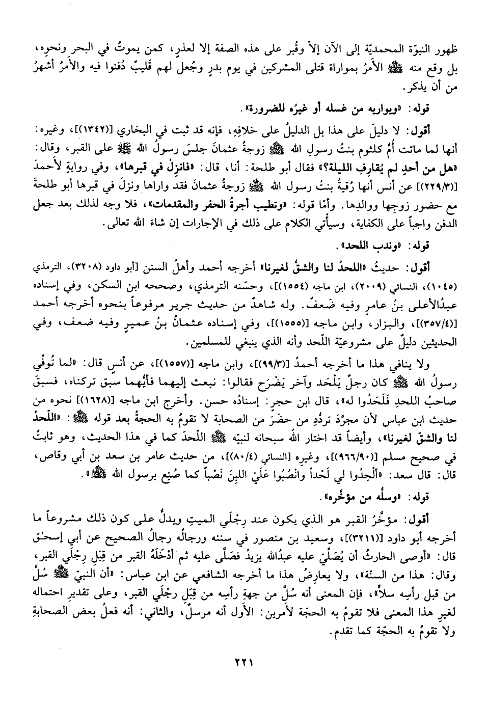 أقول: حديث: "اللحد لنا والشق لغيرنا" أخرجه أحمد وأهل السنن] أبو دأود "3208"] ، الترمذي "1045"، النسائي "2009"، ابن ماجة "1554"] ،عن ابن عباس مرفوعا وحسنه الترمذي وصححه ابن السكن وفي إسناده عبد الأعلى بن عامر وفيه ضعف وله شاهد من حديث جرير مرفوعا بنحوه أخرجه أحمد والبزار وابن ماجه وفي إسناده عثمان بن عمير وفيه ضعف وفي الحديثين دليل على مشروعية اللحد وأنه الذي ينبغي للمسلمين.