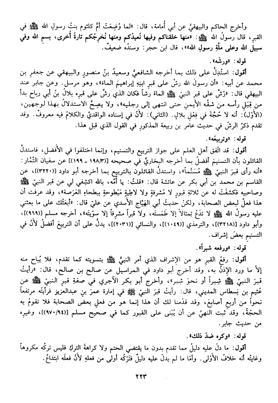 أقول: رفع القبر هو من الإشراف الذي أمر النبي صلى الله عليه وسلم كما تقدم فلا يباح منه إلا ما ورد الإذن به وقد أخرج أبو دأود في المراسيل عن صالح بن صالح قال رأيت قبر النبي صلى الله عليه وسلم شبرا أو نحو شبر وأخرج أبو بكر الآجري في صفة قبر النبي صلى الله عليه وسلم عن عثيم بن بسطام المديني قال رأيت قبر النبي صلى الله عليه في إمارة عمر بن عبد العزيز فرأيته مرتفعا نحوا من أربع أصابع وقد قدمنا لك أن هذا إنما هو من فعل بعض الصحابة فلا تقوم به الحجة وقد ثبت النهي عن أن يبنى على القبور كما في صحيح مسلم وغيره من حديث جابر.