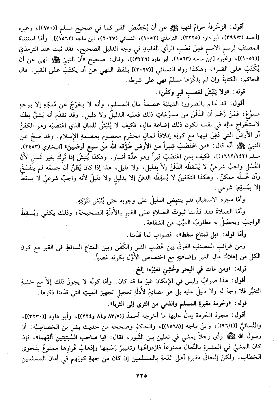 أقول: مجرد الحرمة يدل عليها ما أخرجه أحمد ["5/83، 84، 224"، أبو دأود "3230"، والنسائي "4/96"، وابن ماجه "1568"] ، والحاكم وصححه من حديث بشر بن الخصاصية أن رسول الله صلى الله عليه وسلم رأى رجلا يمشي في نعلين بين القبور فقال: "يا صاحب السبتيتين ألقهما" فإذا كان المشي على المقبرة بالنعال ممنوعا فازدراعها وتغيير رسمها وإذهاب قرارها ممنوع بفحوى الخطاب ولكن إلحاق مقبرة أهل الذمة بالمسلمين إن كان من جهة كونهم في أمان المسلمين