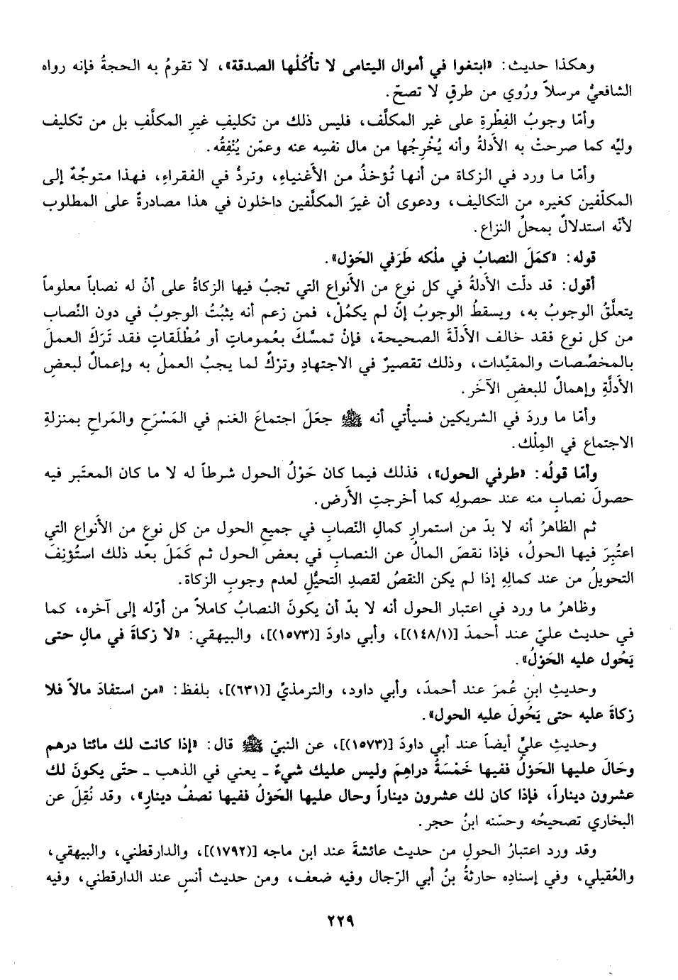 وقد ورد اعتبار الحول من حديث عائشة عند ابن ماجه [1792"] ، والدارقطني والبيهقي والعقيلي وفي إسناده حارثة بن أبي الرجال وفيه ضعف ومن حديث أنس عند الدارقطني وفيه