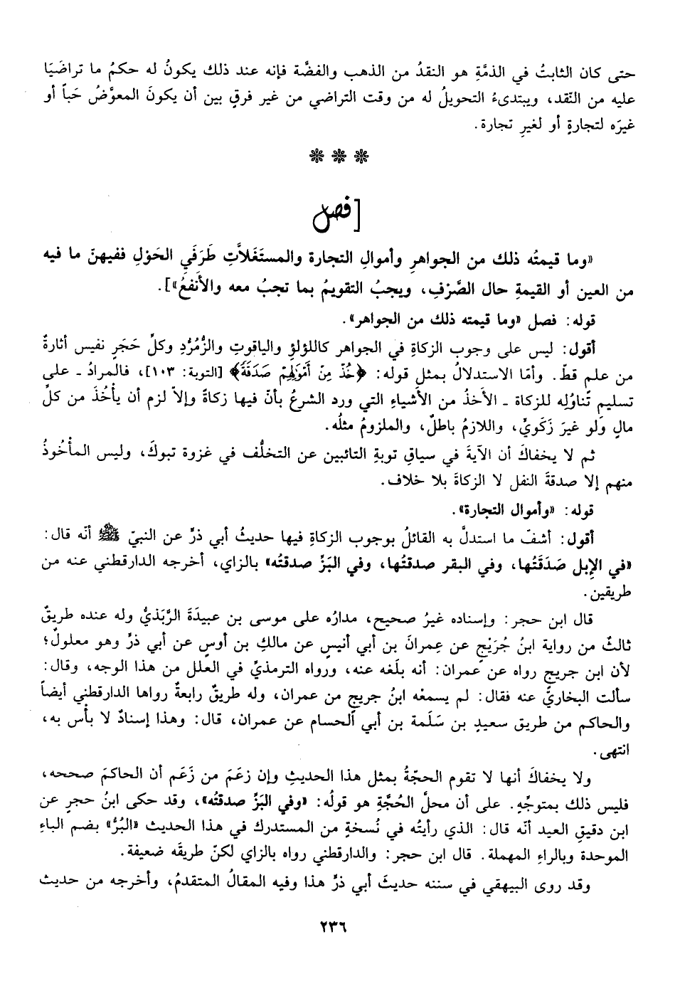 ولا يخفاك انها لا تقوم الحجة بمثل هذا الحديث وان زعم من زعم ان الحاكم صححه فليس ذلك بمتوجه على ان محل الحجة هو قوله: "وفي البز صدقته" وقد حكى ابن حجر عن ابن دقيق العيد انه قال الذي رأيته في نسخة من المستدرك في هذا الحديث البر بضم الباء الموحدة وبالراء المهملة قال ابن حجر والداراقطني رواه بالزاي لكن طريقه ضعيفة.