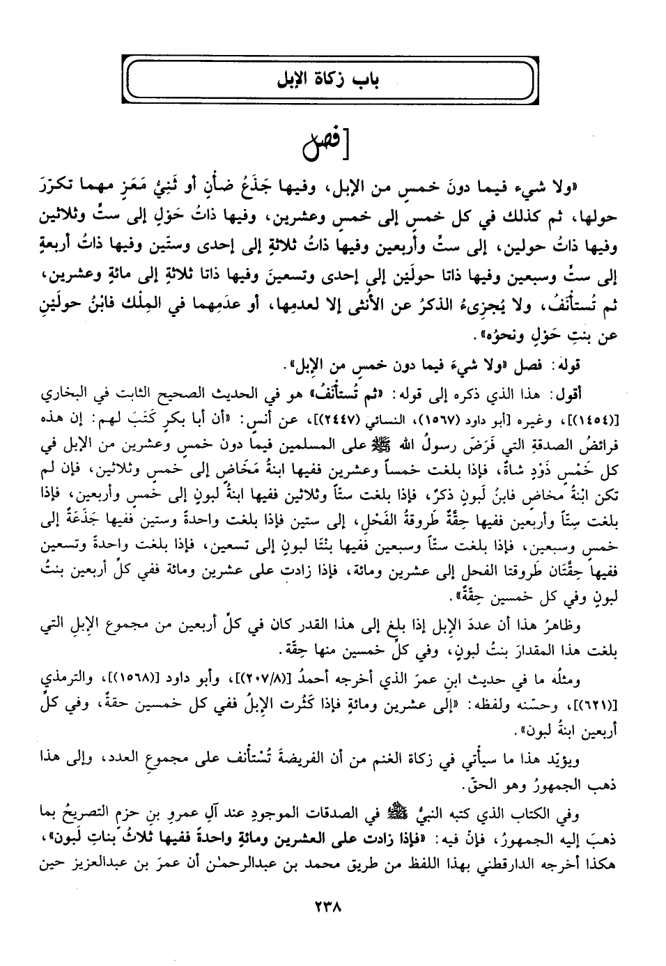 أقول: هذا الذي ذكره إلي قوله: "ثم تستأنف" هو في الحديث الصحيح الثابت في البخاري ["1454"] ، وغيره [أبو دأود "1567"، النسائي "2447"، ان أبا بكر كتب لهم ان هذه فرائض الصدقة التي فرض رسول الله صلى الله عليه وسلم على المسلمين فيما دون خمس وعشرين من الإبل في كل خمس ذود شاة فإذا بلغت خمسا وعشرين ففيها ابنة مخاض إلي خمس وثلاثين فإن لم تكن ابنة مخاض فابن لبون ذكر فإذا بلغت ستا وثلاثين ففيها ابنة لبون إلي خمس واربعين فإذا بلغت ستا واربعين ففيها حقة طروقة الفحل إلي ستين فإذا بلغت واحدة وستين ففيها جذعة إلي خمس وسبعين فإذا بلغت ستا وسبعين ففيها بنتا لبون إلي تسعين فإذا بلغت واحدى وتسعين ففيها حقتان طروقتا الفحل إلي عشرين ومائة فإذا زادت على عشرين ومائة ففي كل اربعين بنت لبون وفي كل خمسين حقة.
