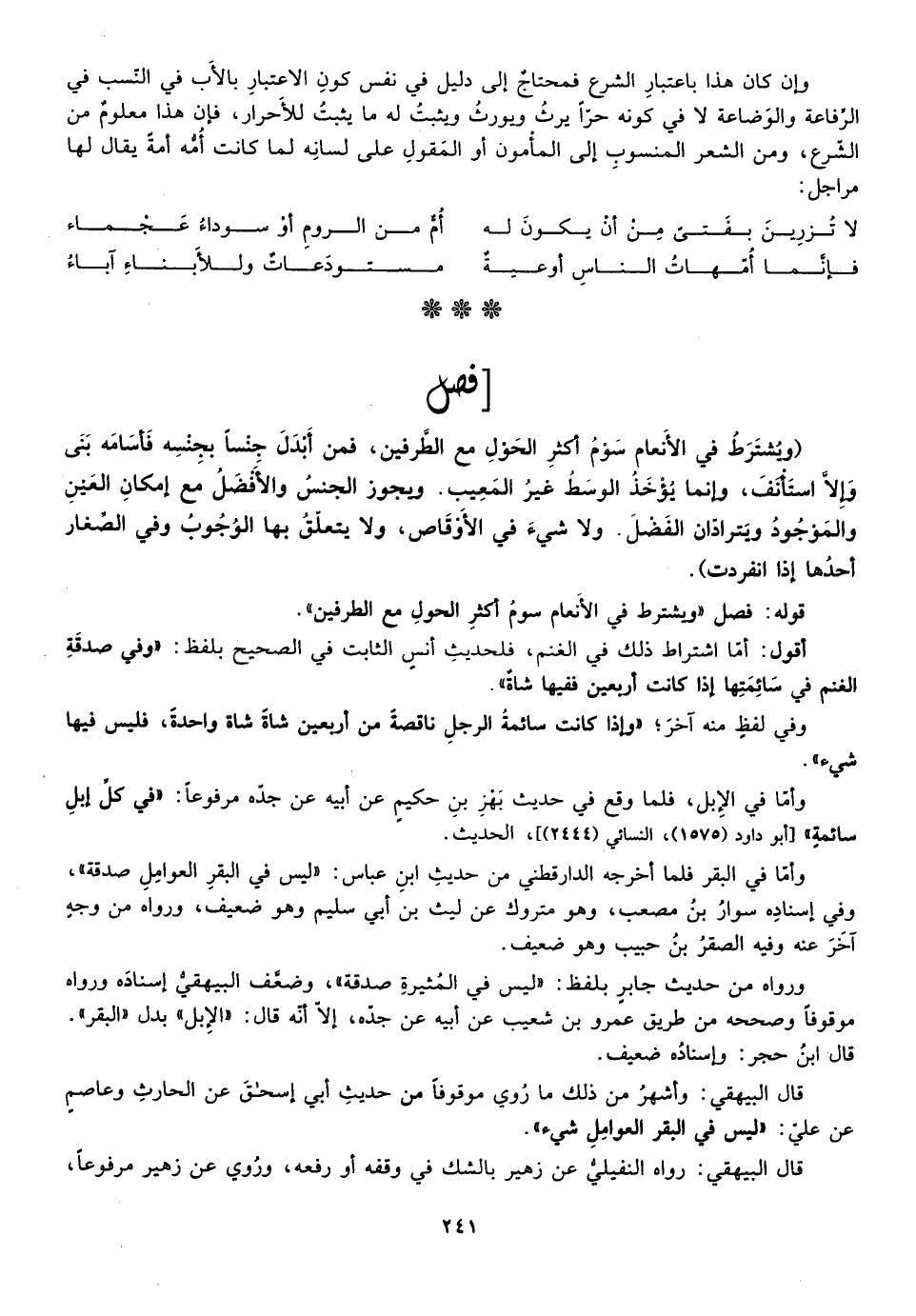 ويشترط في الانعام سوم اكثر الحول مع الطرفين فمن ابدل جنسا بجنسه فأسامه بنى والا استأنف وانما يؤخذ الوسط غير المعيب ويجوز الجنس والافضل مع إمكان العين والموجود ويترادان الفضل ولا شيء في الأوقاص ولا يتعلق بها الوجوب وفي الصغار احدها إذا انفردت] .