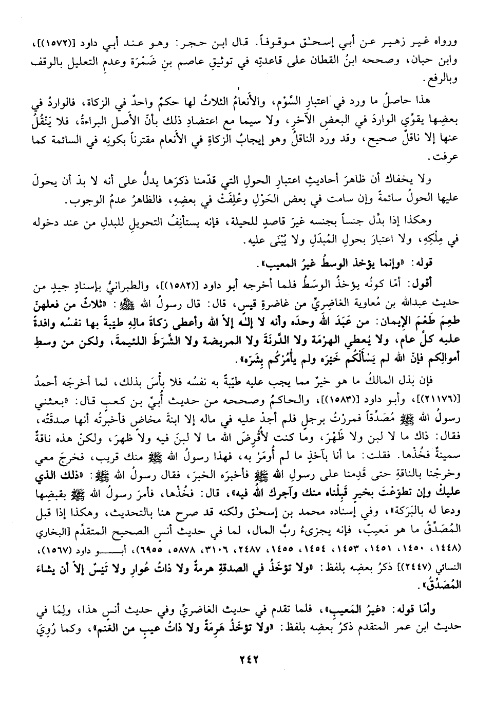 أقول: أما كونه يؤخذ الوسط فلما أخرجه أبو دأود ["1582"] ، والطبراني بإسناد جيد من حديث عبد الله بن معأوية الفاضري من غاضرة قيس قال قال رسول الله صلى الله عليه وسلم: "ثلاث من فعلهن طعم طعم الايمان من عبد الله وحده وانه لا إله الا الله واعطى زكاة ماله طيبة بها نفسه رافدة عليه كل عام ولا يعطى الهرمة ولا الدرنة ولا المريضة ولا الشرط اللئيمة ولكن من وسط اموالكم فإن الله لم يسألكم خيره ولم يأمركم بشره".