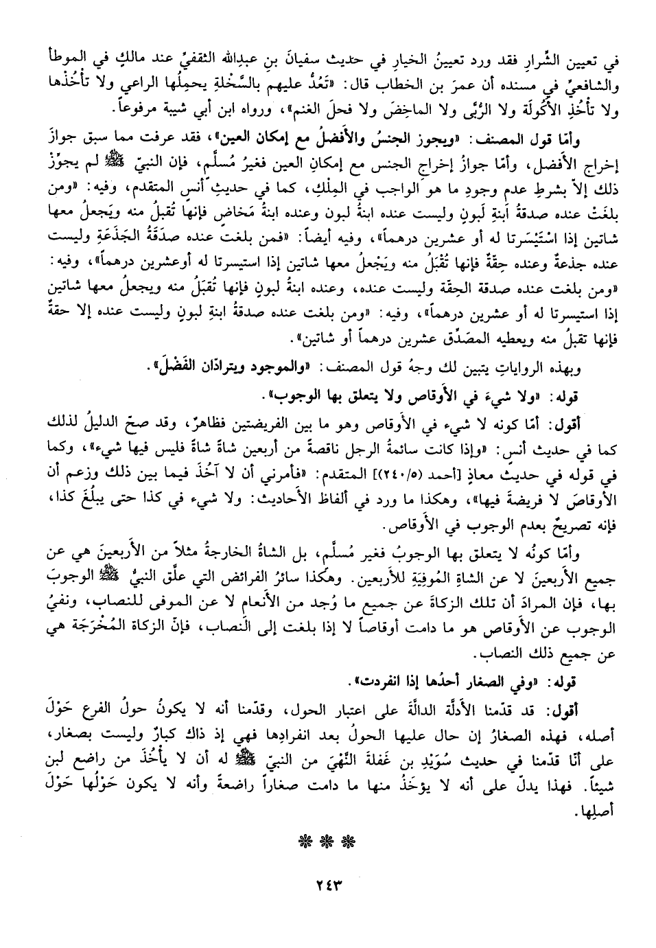 وأما كونه لا يتعلق بها الوجوب فغير مسلم بل الشاة الخارجة مثلا من الاربعين هي عن جميع الاربعين لا عن الشاة الموفية للأربعين وهكذا سائر الفرائض التي علق النبي صلى الله عليه وسلم الوجوب بها فإن المراد ان تلك الزكاة عن جميع ما وجد من الانعام لا عن الموفى للنصاب ونفي الوجوب عن الأوقاص هو ما دامت أوقاصا لا إذا بلغت إلي النصاب فإن الزكاة المخرجة هي عن جميع ذلك النصاب.