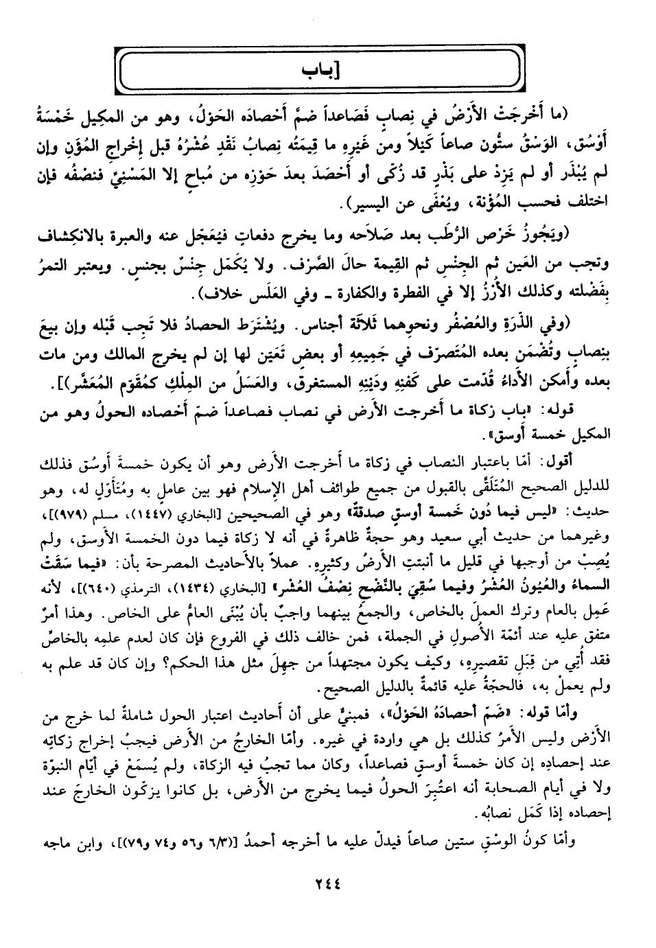 قوله: باب: "زكاة ما أخرجت الارض في نصاب فصاعدا ضم احصاره الحول وهو من المكيل خمسة أوسق".