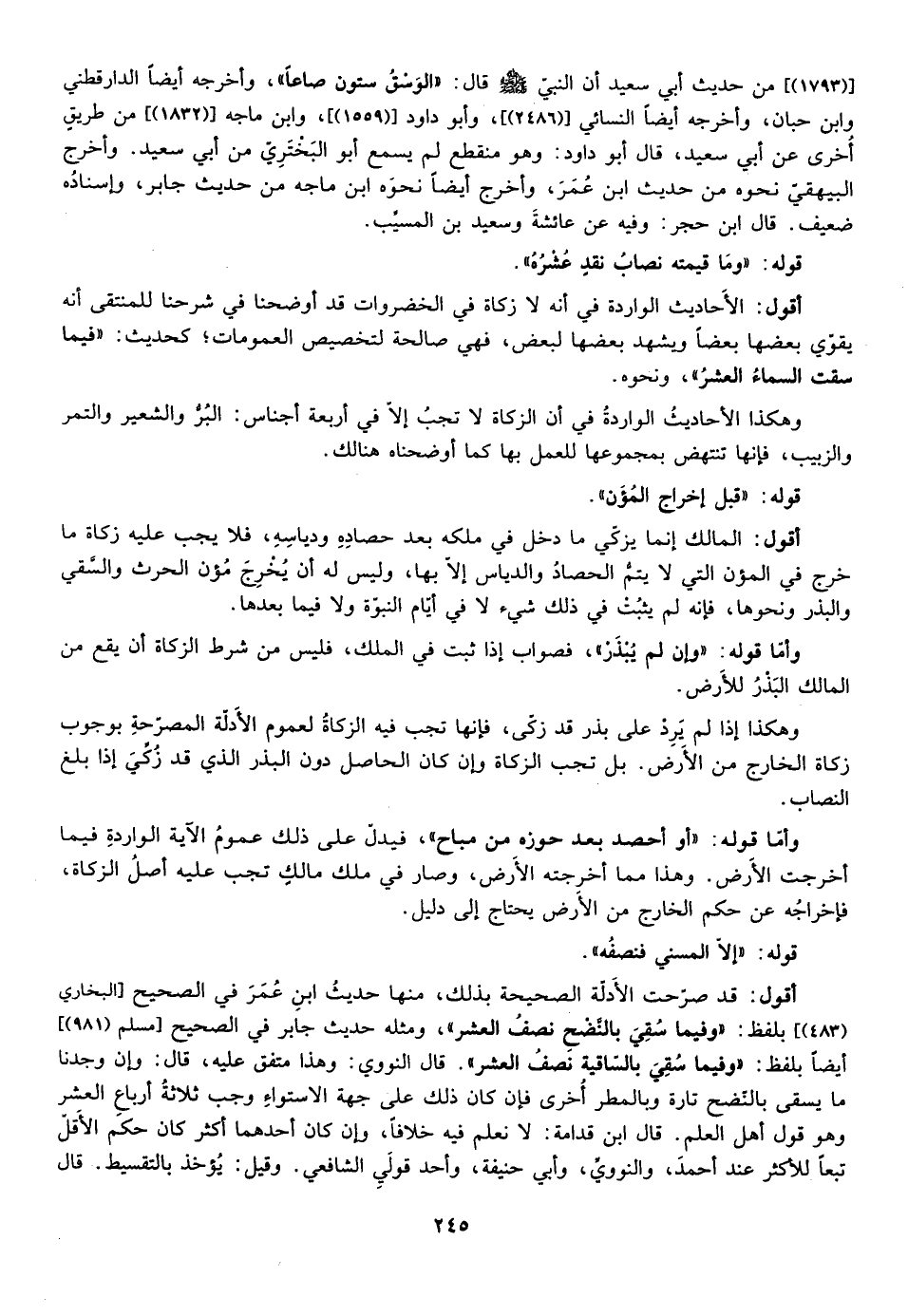 أقول: قد صرحت الادلة الصحيحة بذلك منها حديث ابن عمر في الصحيح بلفظ: "وفيما سقى بالنضخ نصف العشر" ومثله حديث جابر في الصحيح [مسلم "981"، أيضا بلفظ "وفيما سقى بالساقية نصف العشر" قال النووي وهذا متفق عليه قال وان وجدنا ما يسقى بالنضخ تارة وبالمطر اخرى فإن كان ذلك على جهة الاستواء وجب ثلاثة ارباع العشر وهو قول أهل العلم قال ابن قدامة لا نعمل فيه خلافا وان كان احدهما اكثر كان حكم الاقل تبعا للأكثر عند أحمد والنووي وأبي حنيفة واحد قولي الشافعي وقيل يؤخذ بالتقسيط قال