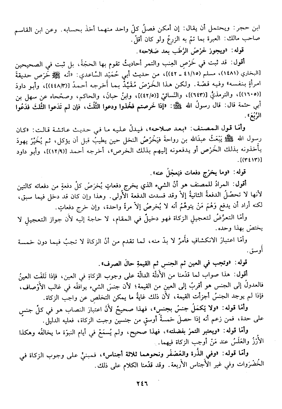 وأما قول المصنف: "بعد صلاحه"، فيدل عليه ما في حديث عائشة قالت كان رسول الله صلى الله عليه وسلم يبعث عبد الله بن رواحة فيخرص النخل حين يطيب قبل ان يؤكل ثم يخبر يهود يأخذونه بذلك الخرص أو يدفعونه اليهم بذلك الخرص أخرجه [أحمد "9/12"، وابو دأود "3413"] .